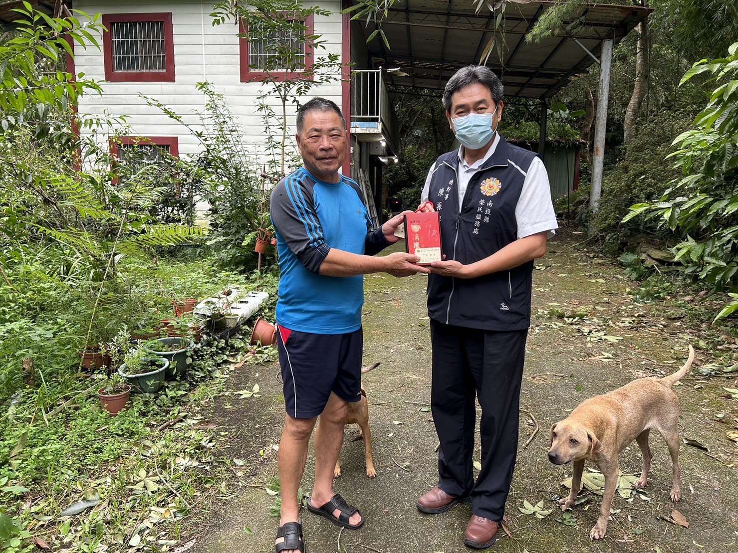 副處長及總幹事兵分兩路,分別探視居住國姓鄉及埔里鎮房先生、陳伯伯、孫伯伯、劉伯伯等居住低窪、土石流地區榮民住戶,除關心颱風期間居家安全狀況,並致贈慰問品表達榮服處關懷慰問之意。其中,居住於埔里鎮墘溪低窪地區的房先生表示,八八風災時,因溪水暴漲,河床遭掏空,家裡淹水盈尺、受災慘重,此次颱風風雨還好,家中沒有災損,感謝榮服處這麼快速的前來關心;另居住於靠近山坡地的陳伯伯也表示,由於山坡地為自家祖產,未濫墾濫伐,這次颱風並未發生土石流,風雨也未造成居家危害,感謝榮服處於風雨稍緩就來探視,直說「揪感心」。