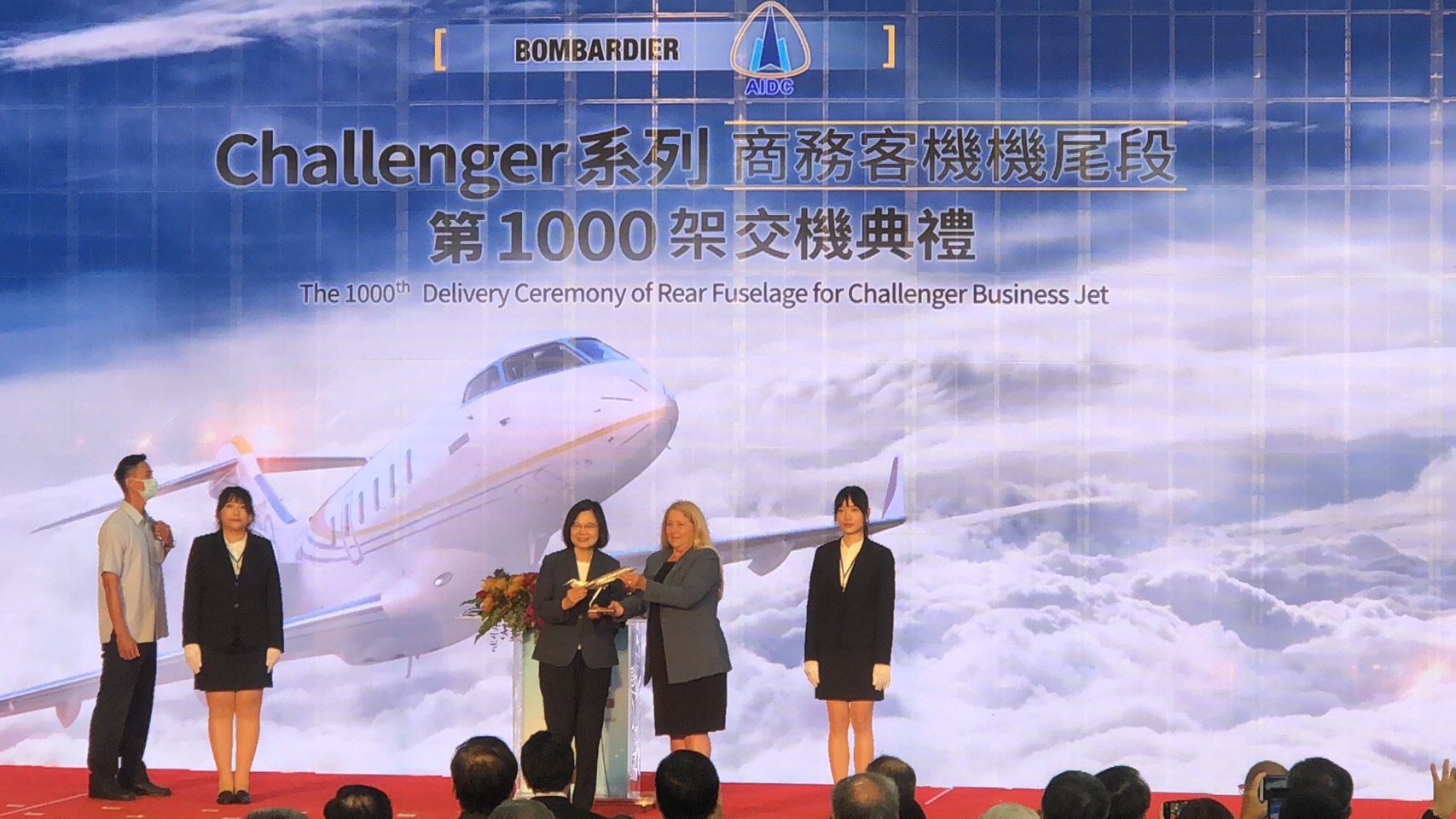 漢翔公司今天辦理「龐巴迪Challenger系列商務客機機尾段第1,000架交機典禮」,蔡英文總統親赴台中主持。
