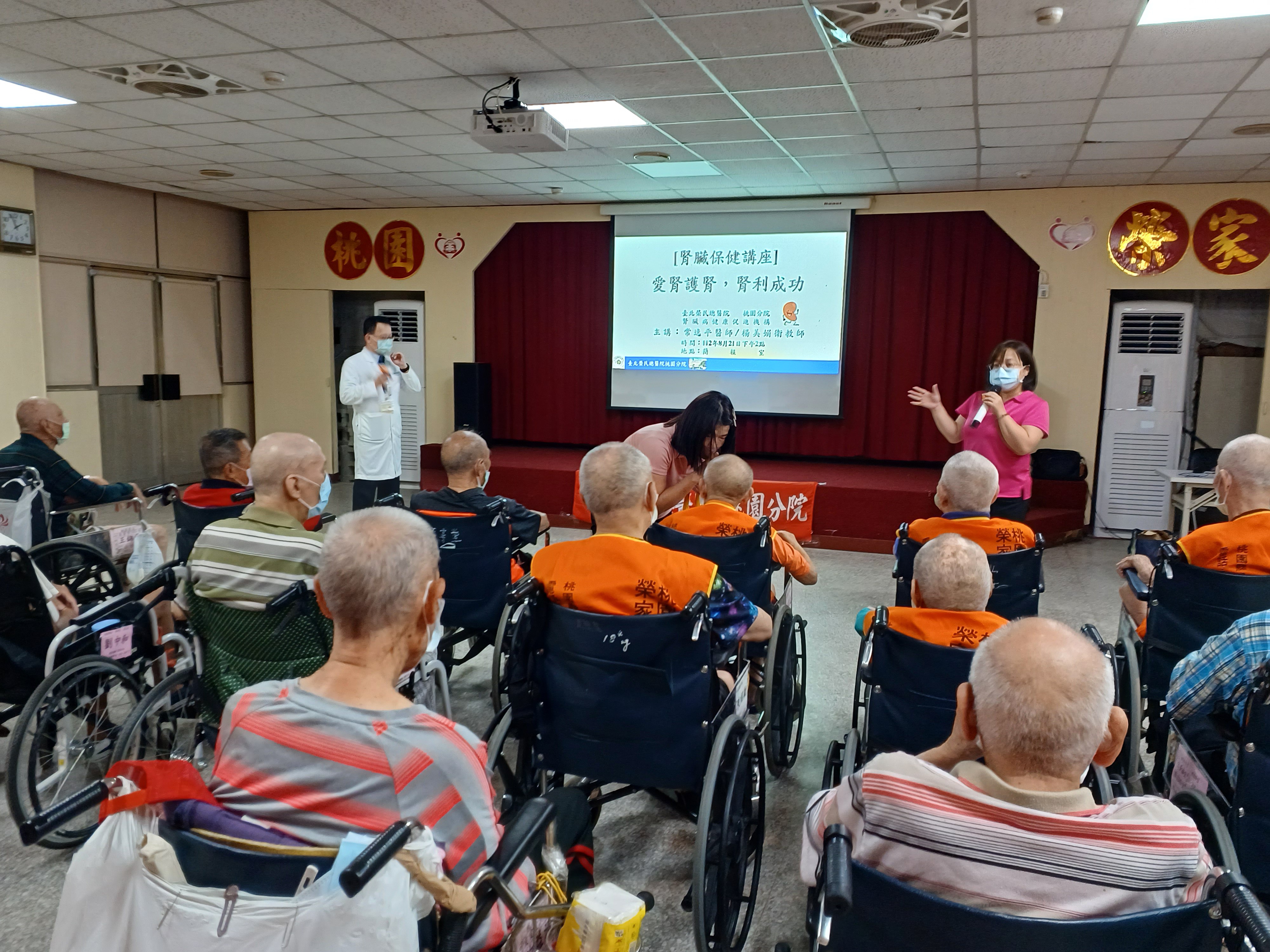 榮家8/22邀請到台北榮總桃園分院內科常逸平主任及其團隊,進行「愛腎護腎,腎利成功」保健講座,課程中告訴我們腎臟就像淨水器一樣:形成調節尿液,並提醒罹患慢性腎臟病的長輩需每3個月定期追蹤。