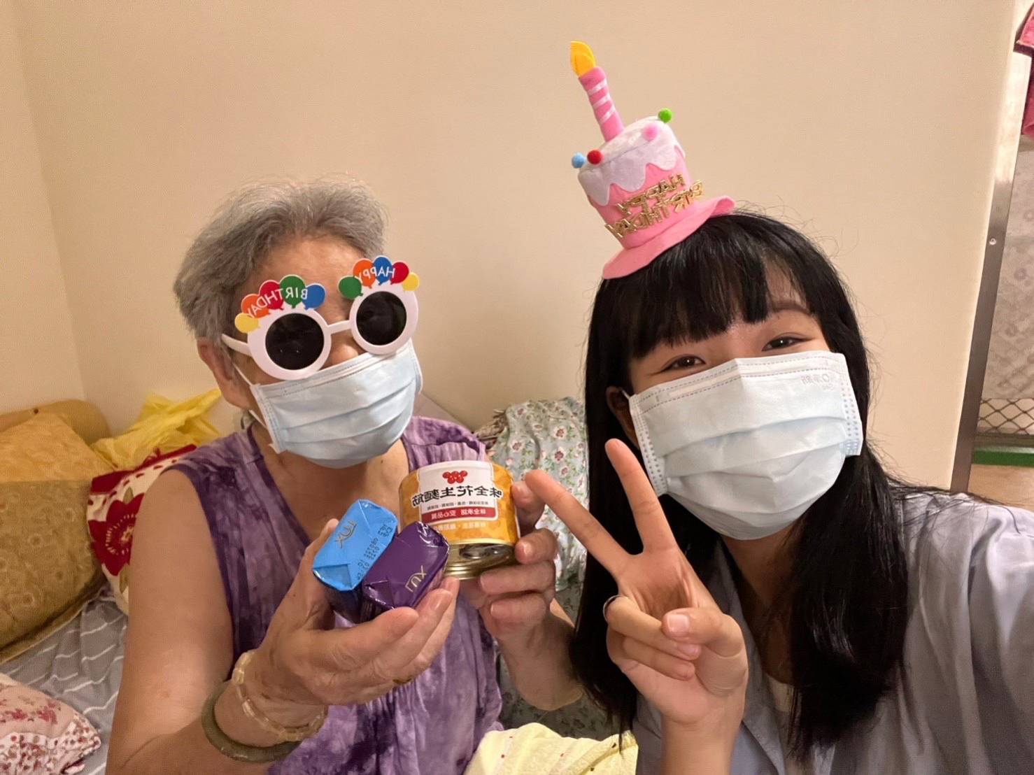 細心的亭蓁於實習期間,得知蔡奶奶是8月份的壽星,她主動準備特別的慶生活動,幫奶奶慶祝86歲生日。兩人一起戴上生日派對墨鏡及蛋糕髮箍,讓奶奶感染年輕人的青春活力。拍照時小花奶奶笑得眼睛都瞇起來囉!她感動的說:「好久沒有這麼開心的過生日了,有這些孫子輩學生溫暖用心的陪伴,讓自己彷彿再次年輕起來!也讓榮家生活更多采多姿」
