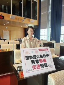台中市議員邱愛珊今(7)日於台中市議會第二次臨時會上,指出今年2023年國慶煙火在臺中,釋放煙火地點在中央公園,當地為人口稠密區,關於當天交通壅塞、人流疏散、接駁交通工具等問題表示關切,因為本次活動預計將湧入50萬人,台中市民都很擔憂到時候主要幹道將淪為停車場,整個市中心壅塞動彈不得,希望市府能提早準備好因應對策。