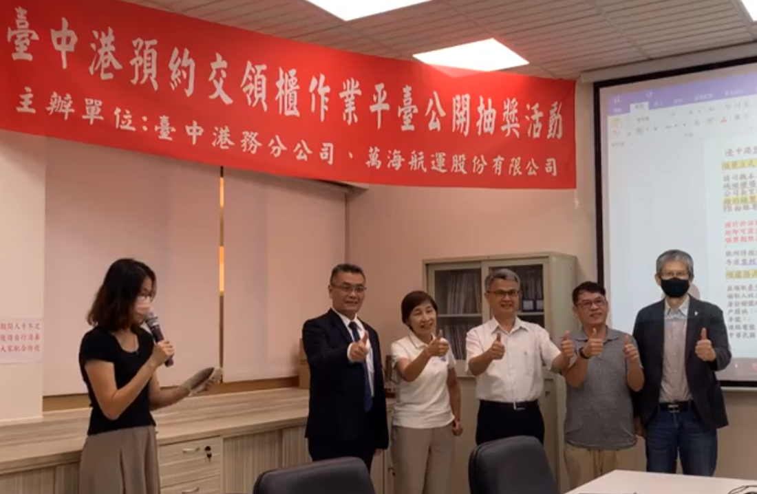 臺中港務分公司與萬海航運股份有限公司今(13)日上午10時於港務大樓聯合舉辦「臺中港預約交領櫃作業平台抽獎活動」,由臺中港務分公司陳榮聰總經理、交通部航港局中部航務中心陳玉琦副主任及萬海航運股份有限公司李俊毅副理代表抽獎,共計抽出最多30名幸運得主。活動全程以臉書線上直播平台與民眾一同共襄盛舉,共同見證臺中港智慧化發展之進程。