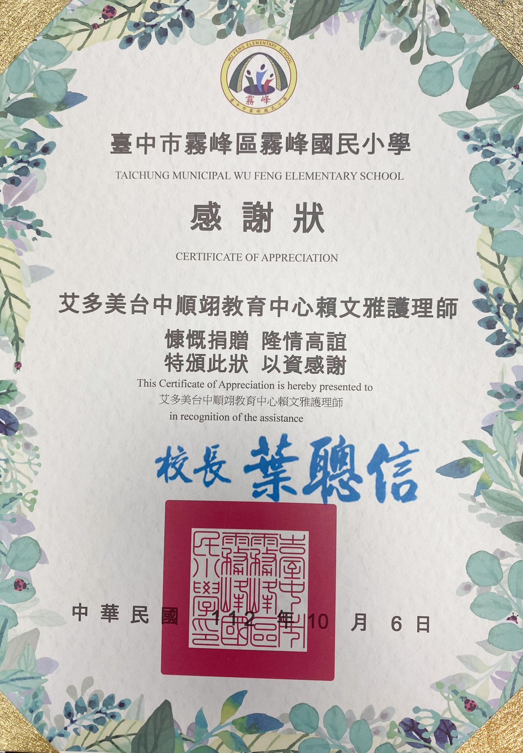 最後,葉聰信校長代表學校致贈感謝狀給台中順奕教育中心及賴文雅護理師,也感謝林錦池里長的引薦,讓霧峰國小學子受惠。整場活動在溫馨的氣氛中,畫下完美的句點。