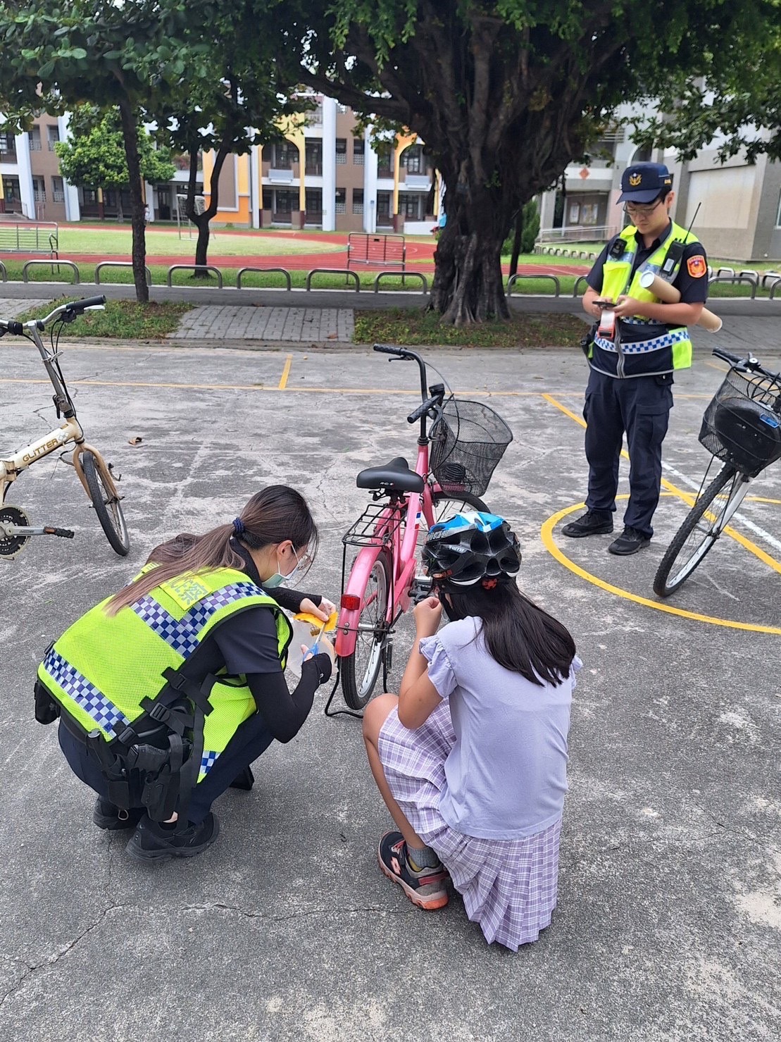 近日因季節轉入秋季,日落時間逐漸提早,許多學童放學時天色已昏暗,雲林縣警察局斗六分局莿桐分駐所關心轄內學童騎乘腳踏車上下學之安全問題,前往校園幫學童們腳踏車上加貼反光條,增加其他車輛的辨識度,守護學童們的上放學安全。