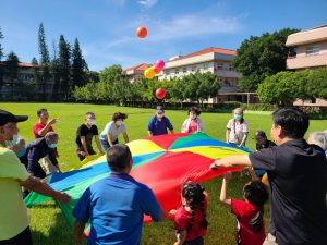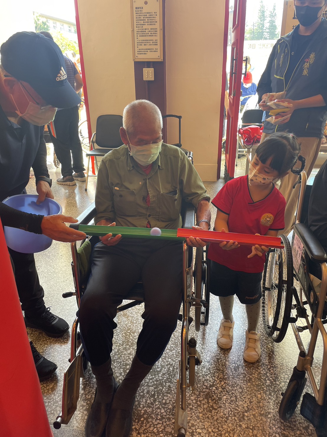 這次活動由加貝爾幼兒園中班師生總計20名前來,與長輩共同參與,在闖關活動開始前,和爺爺奶奶相見歡,一起律動暖身,俏皮活潑的幼童瞬間融化長輩的心,加速祖孫情誼的交流。在合作傳球的過程中,幼童配合長輩的步伐,長輩使出渾身解數達成任務;而大草皮上的彩虹拋高高,大家合力將球上拋的時刻,更是笑聲隆隆,歡呼聲不斷。古早味釣魚攤位,塑膠小魚透過馬達在水中悠遊,大小朋友會心一笑,老幼同樂一起回味長者舊時的童趣。