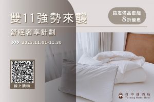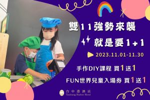 重頭戲雙11強勢來襲,最受歡迎的高人氣FUN世界推出-兒童入場券買一送一(原價$ 199)平均一張$99.5元;「DIY手作課程」買一送一(原價$150)平均一件只要$75元。飯店熱銷精選備品,最受民眾喜愛的經典羽絨枕(2入套組)原價$1,560下殺8折只要$1,248;冬天必買羽絨被+羽絨枕套組(180*120cm)原價$4,280下殺8折只要$3,424;還有讓大小朋友都愛不釋口的台中港酒店零嘴瓦煎燒(36入組)買一送一特價$399元,平均一件只要$199.5元。優惠爆棚讓民眾直呼已經準備下單囤貨,接近年底也可以接寢具換新!誠摯邀請民眾共襄盛舉台中港店雙11盛典。