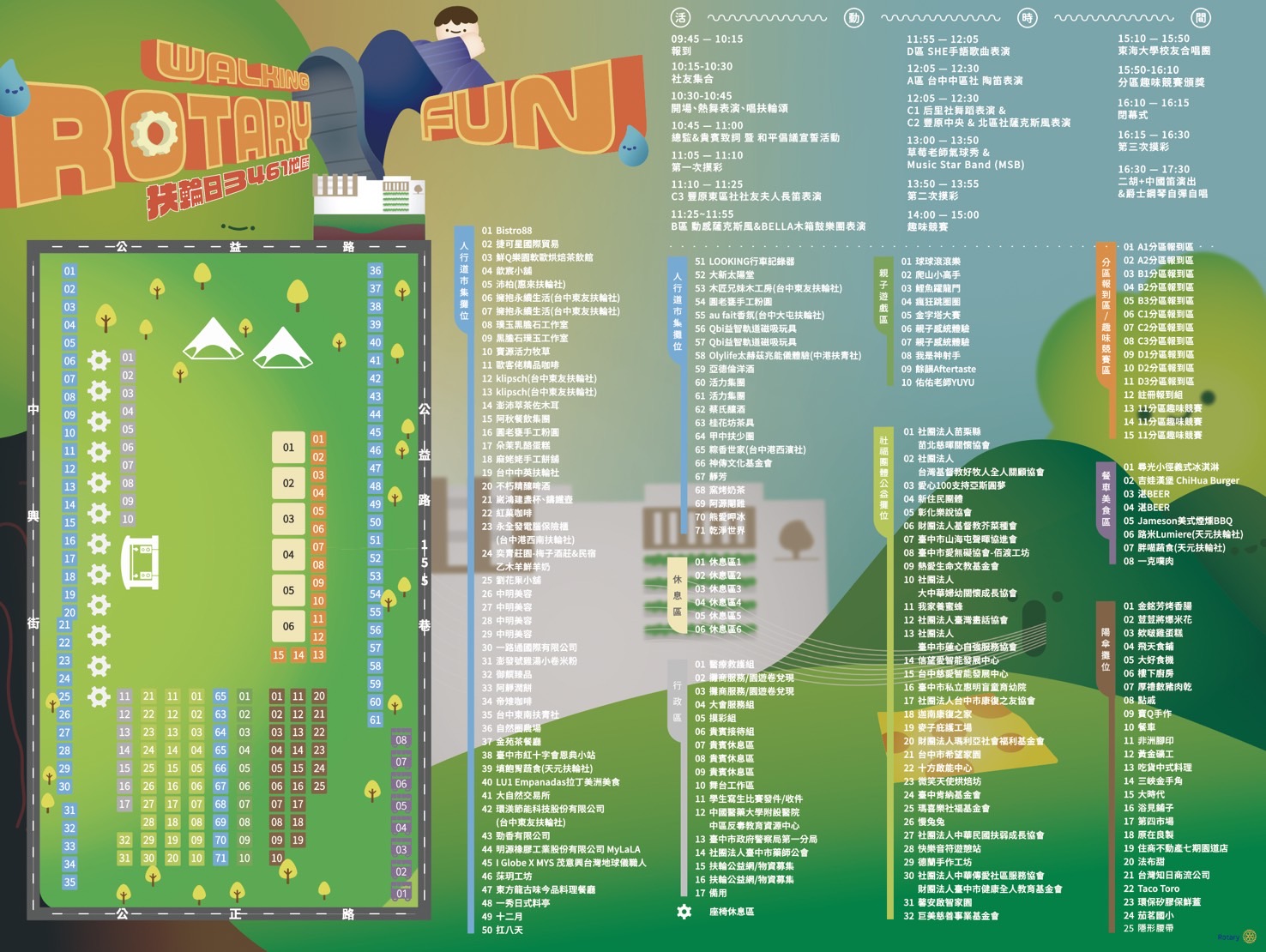 扶輪服務日除了作公益服務外,也舉辦嘉年華活動,希望台中市民與每位扶輪社友都能帶著家庭成員來參加,所以規劃了許多適合親子參與的活動,包括國中小學生寫生比賽、認識扶輪親子遊戲、根除小兒麻痺公益時尚野餐、11分區社友趣味競賽、美食小吃文青手作園遊會,也有參與爵士音樂節演出的扶輪社友進行精彩的音樂節目表演,以及各式精彩的搖滾、國樂、爵士等音樂演出。