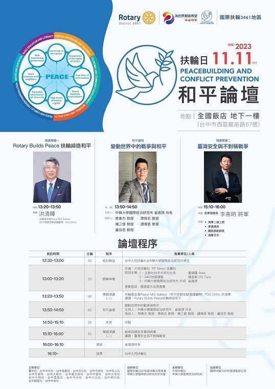 每年的11月11日是世界各國的和平紀念日,23-24年度國際扶輪年度主題是「為世界創造希望」,國際扶輪呼籲全世界扶輪社友關注和平議題,並強調「建立和平的環境才是希望生根的土壤」。位於台中市的國際扶輪 3461 地區,定於今年11 月 11 日(星期六)於台中市民廣場(公益路勤美前)舉辦「扶輪服務日」,當天除了由扶輪社友進行公益慈善服務照顧弱勢社福團體外,今年更是呼應國際扶輪重視和平的主題,舉辦了「和平論壇」宣揚扶輪締造和平及防止衝突對抗的貢獻,更集合超過二千名扶輪社友一起穿著白色的和平鴿T恤,舉行倡議和平的宣誓儀式,現場並有數百隻和平鴿展翅高飛,倡導國際扶輪積極和平的指標,包含「與鄰為善」、「杜絕貪腐」、「效能政府」、「公平貿易」等。作為台灣的扶輪社友,一起向全世界發聲和平是人類唯一選項,我們拒絕讓衝突成為生活的方式,積極採取行動締造和平環境,並讓世界充滿希望。