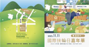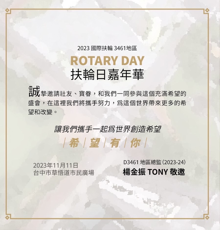 11月11日扶輪日當天將由 國際扶輪3461 地區 23-24 年度地區總監楊金振 Tony帶領參與社友宣誓和平倡議,並由台中市盧秀燕市長、社會局廖靜芝局長、衛生局曾梓展局長(或前述首長指派之代理人),與總監 Tony帶領社友,臺中市政府與國際扶輪 3461 地區一起舉行捐贈台中市政府社會局公益慈善平台的捐贈儀式,並宣導預防毒品危害的決心。