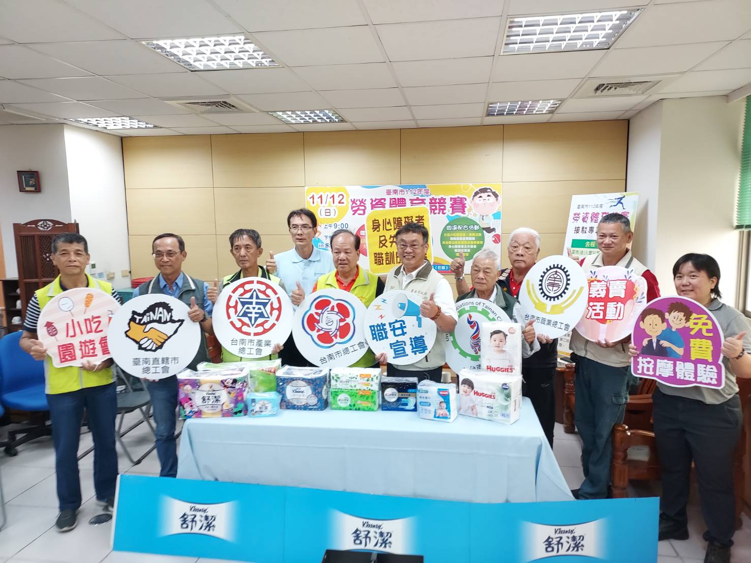 勞資運動會的愛心義賣活動這次仍少不了衛生紙跨國大廠-金百利克拉克台灣分公司(即舒潔衛生紙)的贊助支持,其自2005年以來參與勞資體育競賽慈善義賣活動已邁向第19個年頭,每年固定捐出旗下深受消費者喜愛的品牌熱銷產品參與義賣,迄今已累計捐出市價近千萬元的產品,當日民眾可以低於市價購買有品牌的優質好物,民眾不但可以搶好康,還可以參與公益。本市愛心不落人後的台南市總工會、大台南總工會、台南市產業總工會、臺南市總工業會都加入愛心義賣活動的行列,讓愛心的民眾有更多購買的選擇,也希望藉由這樣的義賣活動讓民眾感受到小小力量,也能匯聚更多愛心的力量。