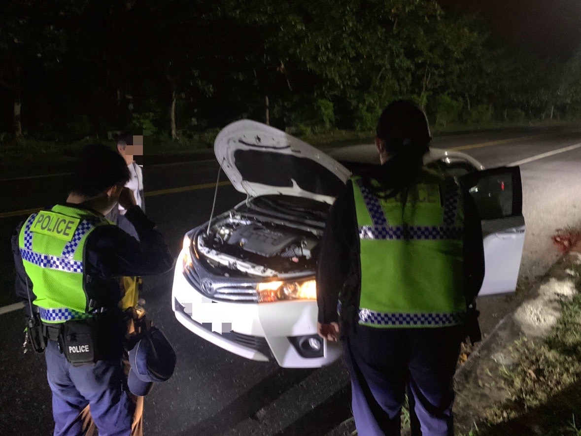 經員警了解,55歲李姓女子表示駕車至此賞夜景,欲離開時不知何故車輛突然無法發動,一時之間不知如何是好,陳所長在了解情況之後,先行關閉車輛的全部開關並嘗試重新啟動,在幾番嘗試下,研判應該是車輛的電池沒電,所以才導致車輛無法發動,遂使用巡邏車上備用之電霸協助接電,才順利使李女車輛可正常啟動,順利下一個行程。