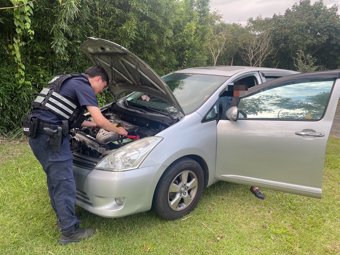 鳳林分局光復分駐所接獲報案後,警員王智逸及魏柏諭2人立即前往現場協助,並熟練地使用警用巡邏汽車協助接電,經測試數次後,順利發動車輛,許民不停感謝警方的熱心協助,在短短的時間內將困難排除。