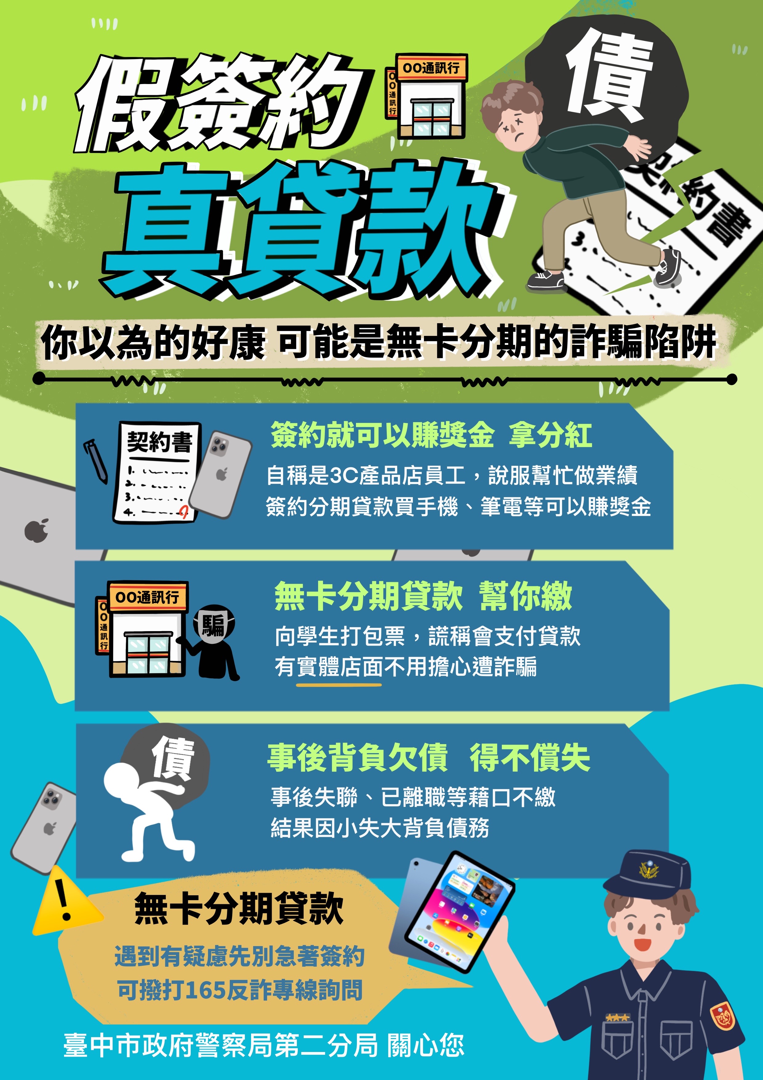 日前中部有多所大學傳出有學生遭「無卡分期」詐騙,不肖人士以投資手機、電腦等3C產品為由,「簽約立刻拿5千佣金」,鼓吹學生簽下5萬至10萬元不等的無卡分期契約,這些大學生不但產品沒拿到,還被融資公司催繳款項,詐騙集團就是看準這些大學生「乾淨沒有案底」、「無卡貸款核款容易」,而成為詐騙標的,這些大學生由於金融知識不足,還拉同學一起被騙,致使約有600多名學生受害。
