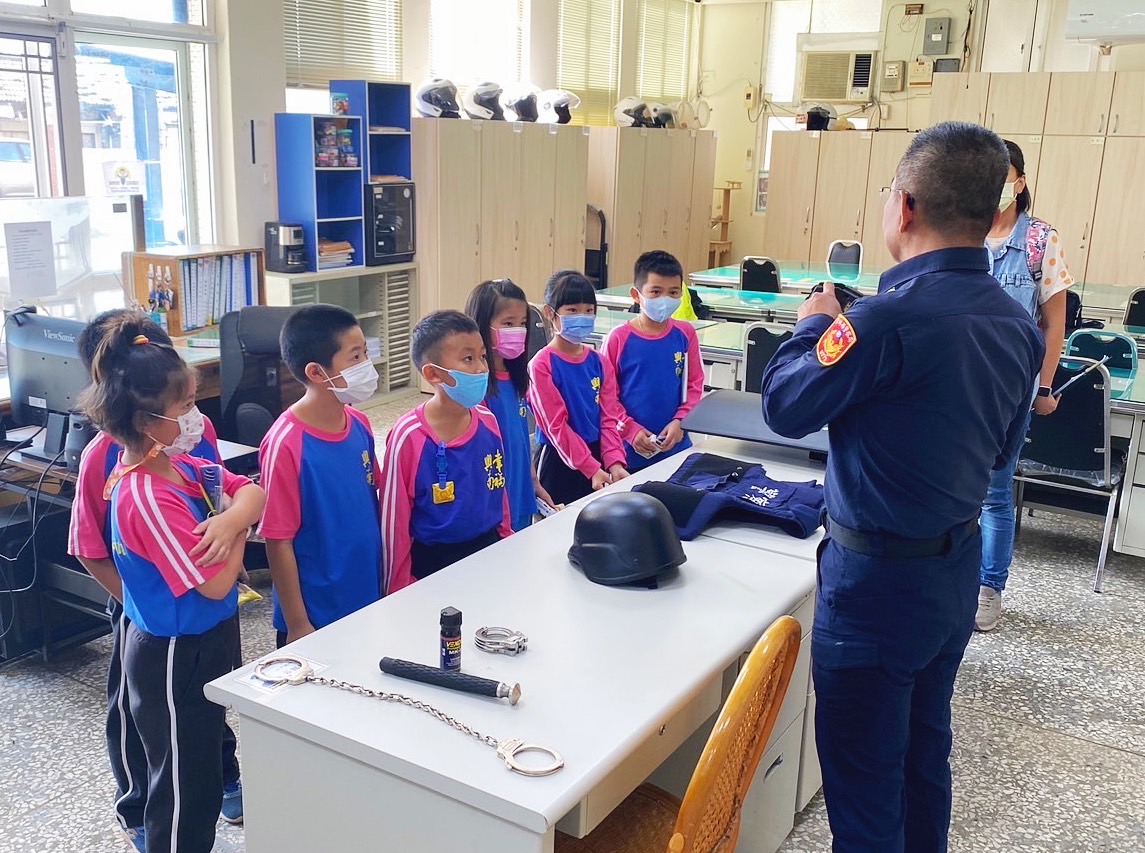所長陳智偉首先介紹警察的工作內容,包含巡邏勤務、犯罪偵查、交通取締與疏導及為民服務等事項,同時逐一展示防彈背心、警棍、盾牌、辣椒水及手銬等警察應勤裝備,讓所有幼童們輪流試穿與體驗;經過一個小時緊湊的參訪,師生們對反詐騙、婦幼及交通安全有了基本概念,且對於警察工作也更加認識。