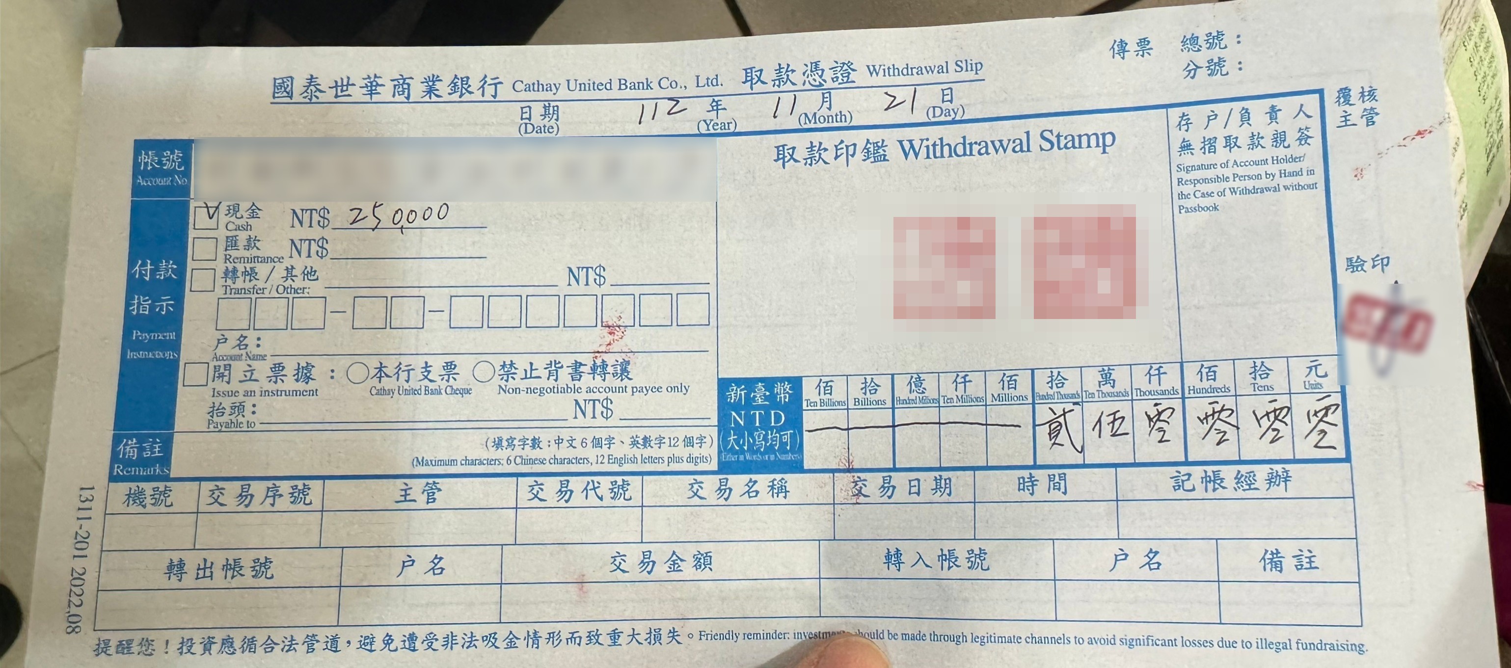 日前臺中市一名46年次唐姓婦人前往國泰世華篤行分行欲提款新臺幣25萬元,經行員關懷慰問,唐婦前後說詞不一致,經驗老道行員直覺有異,趕緊通報轄區員警到場,經員警耐心勸說及案例剖析,婦人才放棄提款,成功守住荷包。
