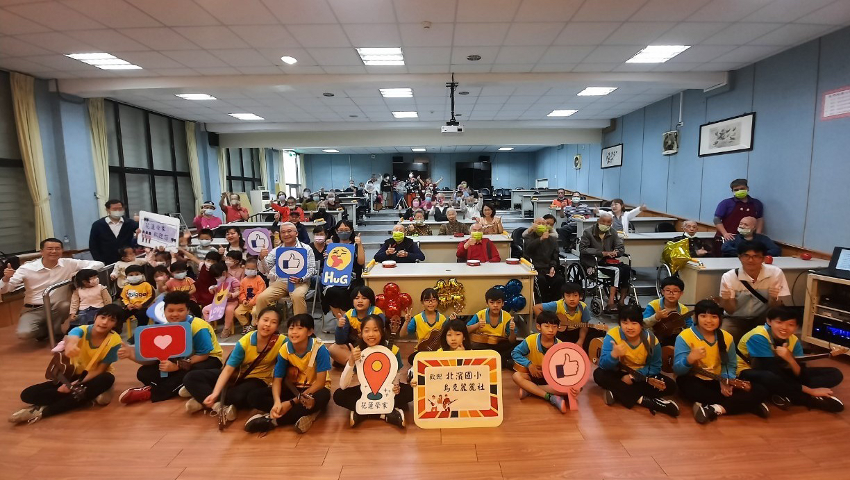位於花東海岸線的北濱國小十多年前成立烏克麗麗社團後,帶著孩子透過一把小小樂器彈奏樂曲來感動大家,103年更登上夏威夷珍珠港的密蘇里艦表演,讓愛傳動到世界的各個角落。本次把精彩又熱情的表演帶進榮家,演奏多首好聽曲目,如少女的祈禱、大黃蜂及在地音樂家郭子究先生的回憶等,雖然長輩們不一定知道歌曲名稱,但當熟悉的旋律一出,就直點頭表示「聽過、聽過」,也拿起桌上的手搖鈴、沙鈴等樂器合奏,彷彿來到一場小型音樂會,實在溫馨。