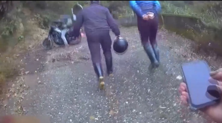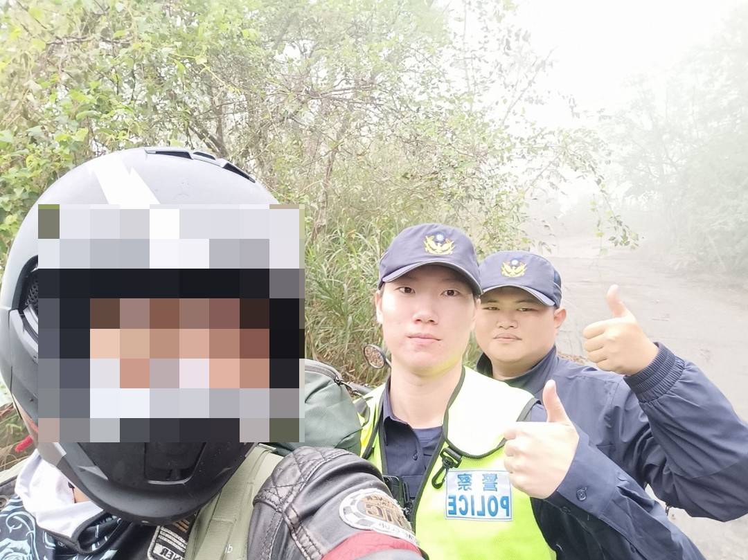 幾經波折後,郭員發現前方景色與報案人所描述的位置相近,便呼喊著報案人姓名來辨識其位置,直到見到報案人向警方揮手示意,才讓警方放下心中大石,千鈞一髮之際2員與義消合力,費盡一番苦心順利將大型重型機車從泥濘中抬起;隨後2員駕駛警車在前民眾尾隨在後,花費近2小時後終於順利下山。