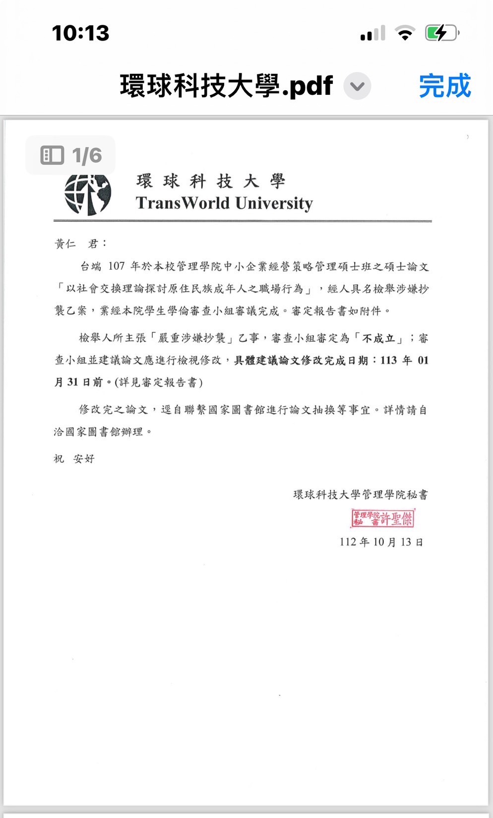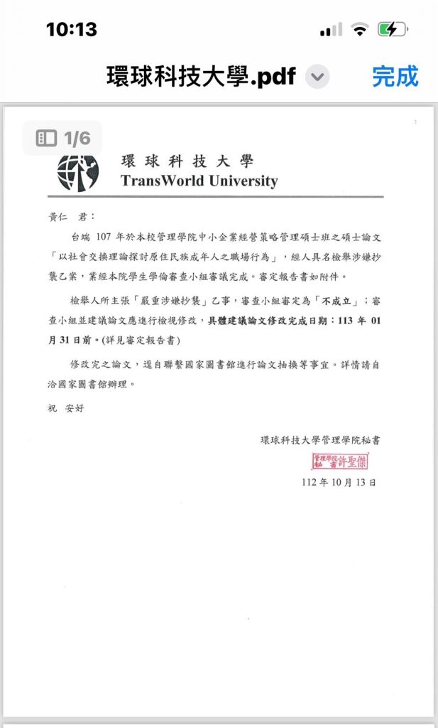 摘錄環球科大審定報告書第二頁第十六、第十七行指出,檢舉者將整本論文進行比對的作法「有失專業」並且原比對系統所得之相關段落或字句都「有失準確」另外審定報告書第三頁第四、第五行指出,黃仁的碩士論文「以社會交換理論探討原住民族成年人之職場行為」並沒有涉嫌抄襲情事;而該論文實屬於原創性論文,並且亦有其學術性貢獻度。