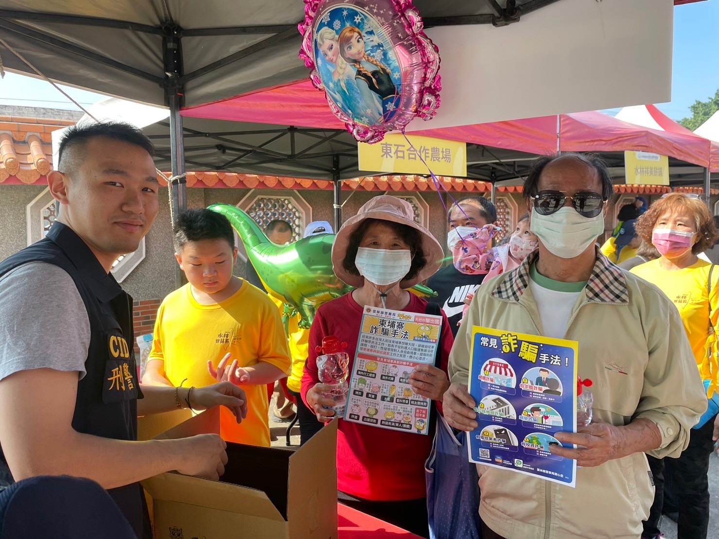 雲林縣警察局北港分局今(9)日配合水林鄉農會「2023水林甘藷節」活動,在現場分送宣導(品)單及實施「防詐騙、反毒暨婦幼、交通安全、防制酒後駕車」等犯罪預防宣導,並鼓勵民眾下載「165反詐騙APP」、「警政服務APP」,藉以掌握最新詐騙資訊與警政相關服務。縣長張麗善更現身與民眾熱情互動,分享交通安全準則,也向民眾呼籲反詐騙的重要性。