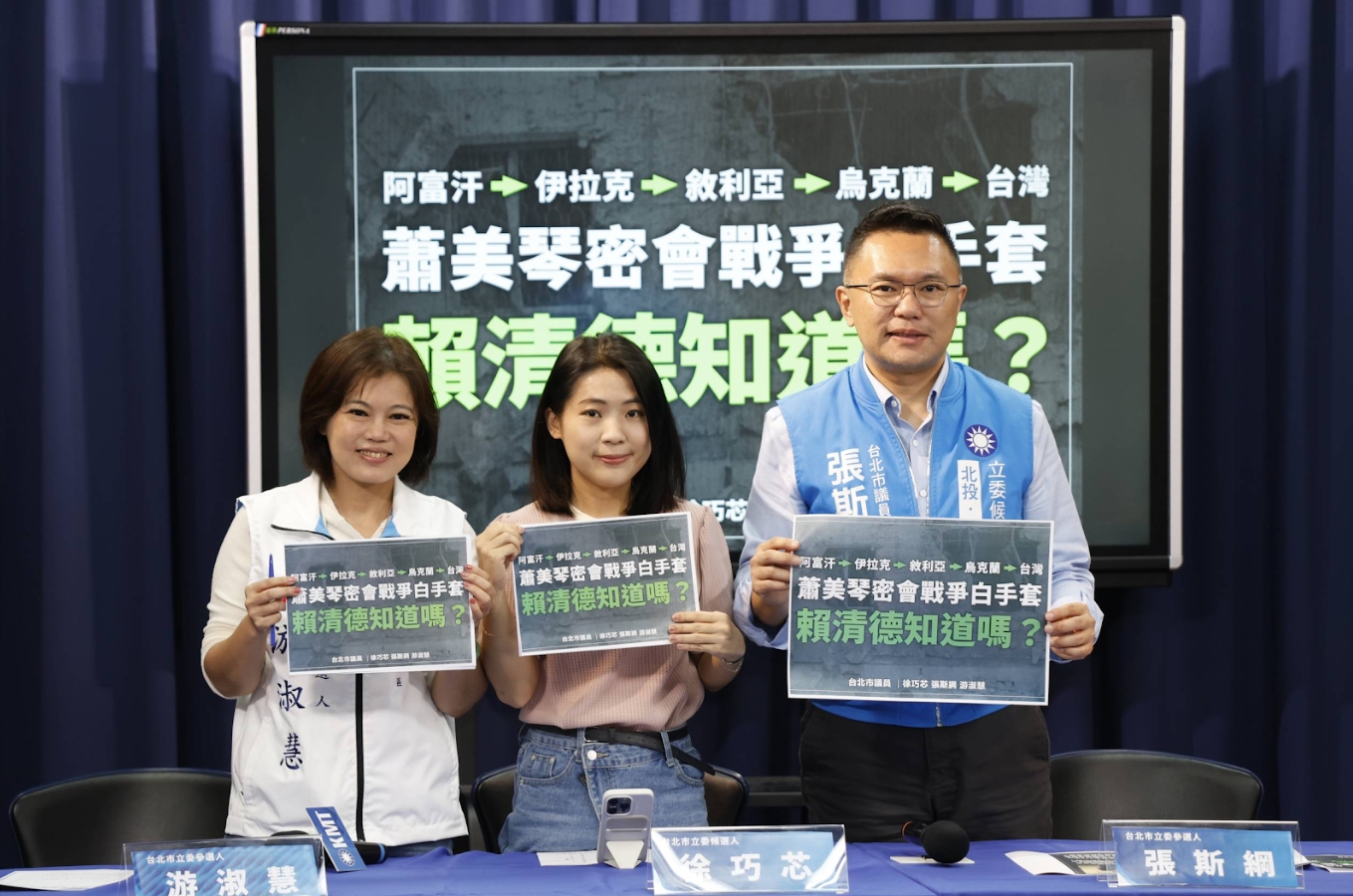 中國國民黨台北市立委候選人徐巧芯、張斯綱、游淑慧今(14)日召開「蕭美琴密會戰爭白手套,賴清德知道嗎?」記者會,披露民進黨副總統候選人蕭美琴密會「美國精神」(Spirits of America,SOA)的創辦人 Jim Hake。該組織的操作模式是會提前進入戰爭高風險地區,介入當地政府國防政策,建立民兵或類似團體,甚至主張「台灣若干年內恐面臨中國大陸武力犯台危機」。請問蕭美琴是否讓對方知道台灣是安全的?還是其實蕭美琴也認同SOA的說法,認為兩岸之間已經緊張到隨時可能開戰?這完全與民進黨總統候選人賴清德跟蕭美琴說要維持現狀完全背道而馳!賴蕭配跟全民表示兩岸會和平、會維持現狀,但對方主張兩岸會發生戰爭,難道沒有任何反駁?他們並對賴清德與蕭美琴提出「五問」,質疑蕭美琴引進SOA,賴清德是否知情?民進黨是否認同台灣將面臨大陸武力犯台危機?民進黨敢保證「今日烏克蘭,明日台灣」不會發生嗎?
