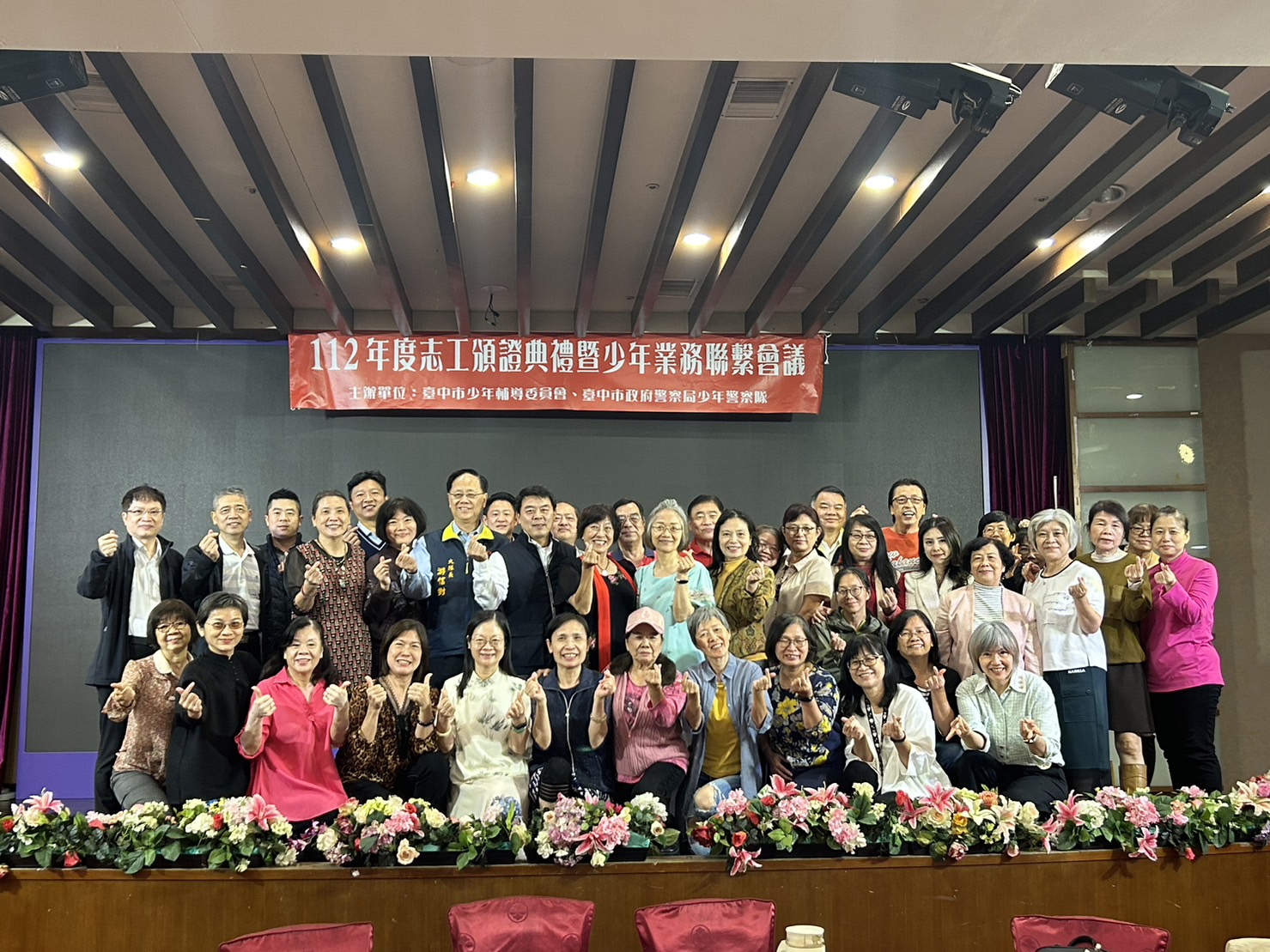 臺中市政府警察局少年警察隊於15日舉辦志工頒證典禮,表揚66位服務期滿志工,其中36位為服務優異志工,特由臺中市政府警察局行政科蔡春富科長、警察志工大隊大隊長游信對及少年隊隊長高嘉陽出席頒獎。