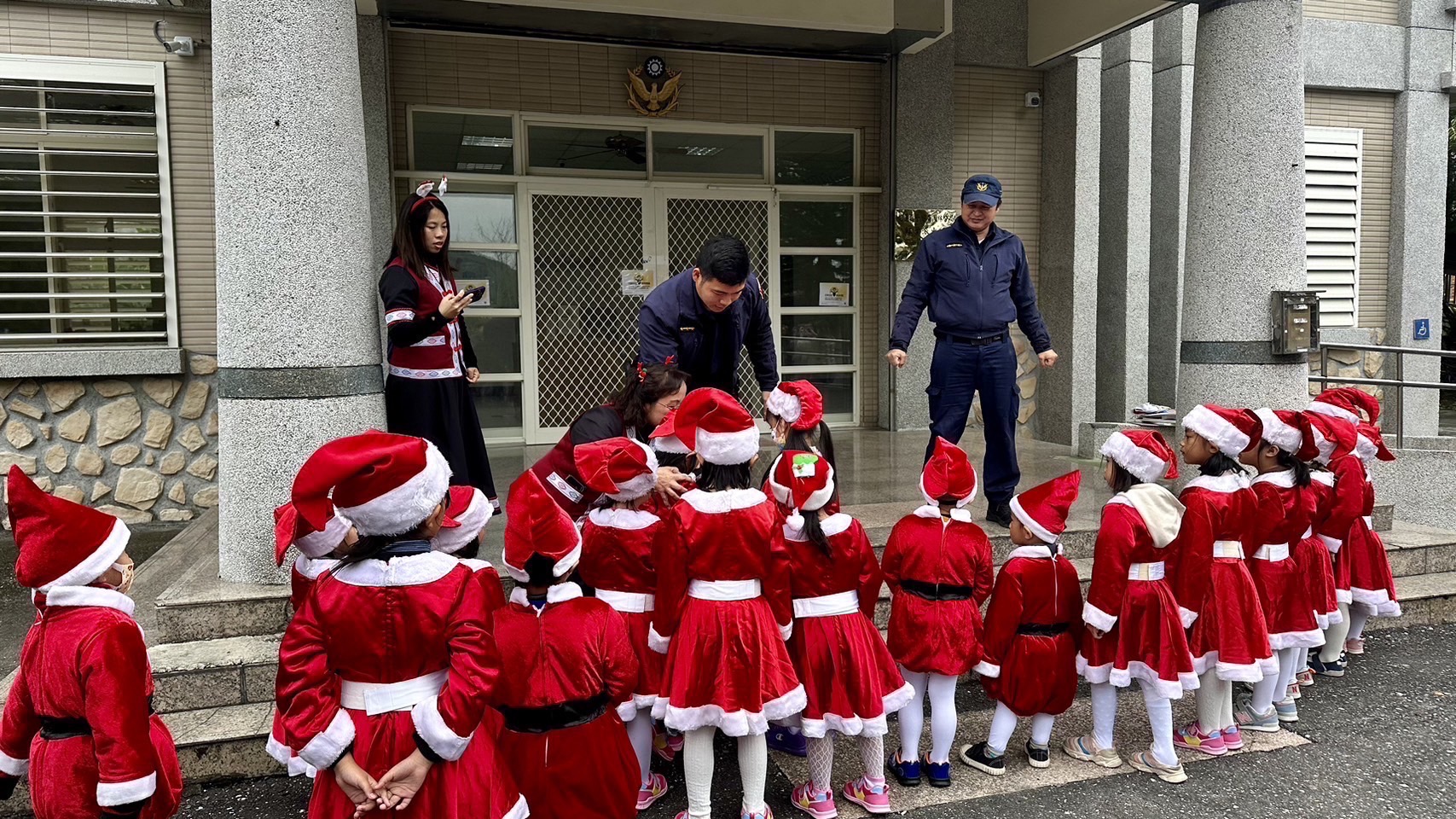 天真活潑的幼兒園小朋友們特別頭戴紅色聖誕帽,童聲稚語裝扮成聖誕老公公,結合舞蹈大聲的報佳音唱詩歌,副所長林吳建國及警員謝有勝亦不忘向在場師生們宣導反詐騙、預防犯罪及交通安全等法律知識與安全觀念,讓平時嚴肅的派出所內充滿了溫馨的聖誕節氣氛。