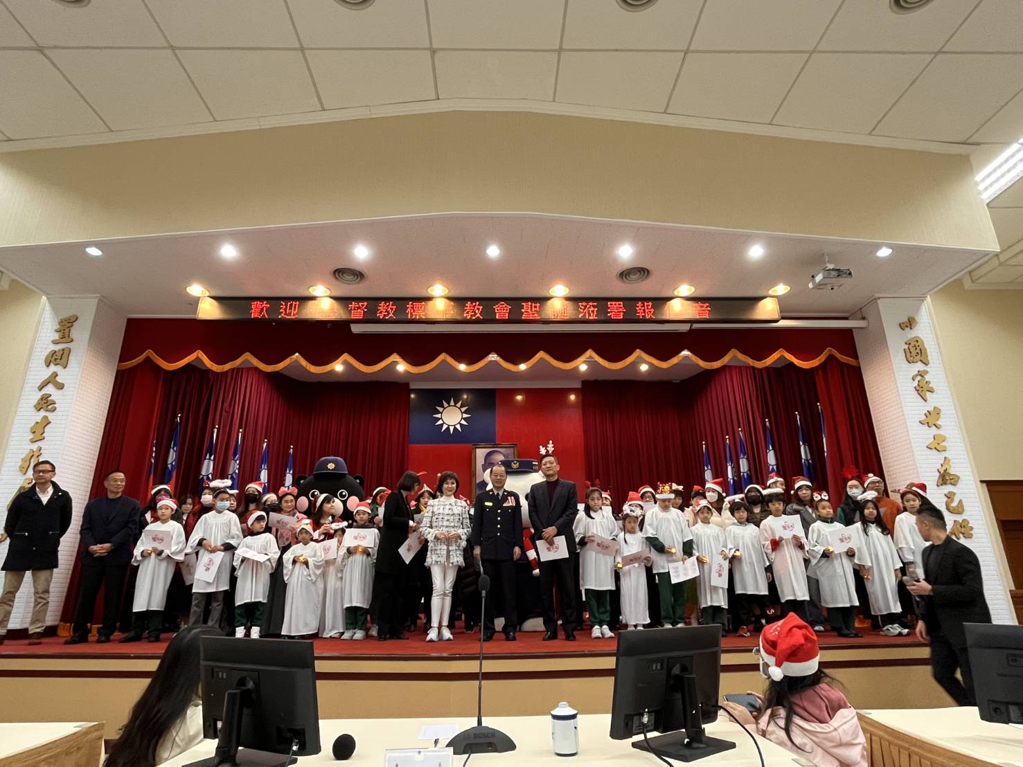署長黃明昭為感謝鄰居基督教標竿教會及反詐大使白嘉莉蒞臨警政署向全國警察同仁致敬,特別邀請這些支持警察的朋友們至署務會報會場,與參加署務會報的同仁分享聖誕佳節氣氛。黃署長表示,現在適逢選舉競選活動期間,各警察機關都致力確保各項選舉活動的順利與安全,且為了守護民眾財產安全,更要持續積極打擊詐騙犯罪及進行全方位反詐宣導。