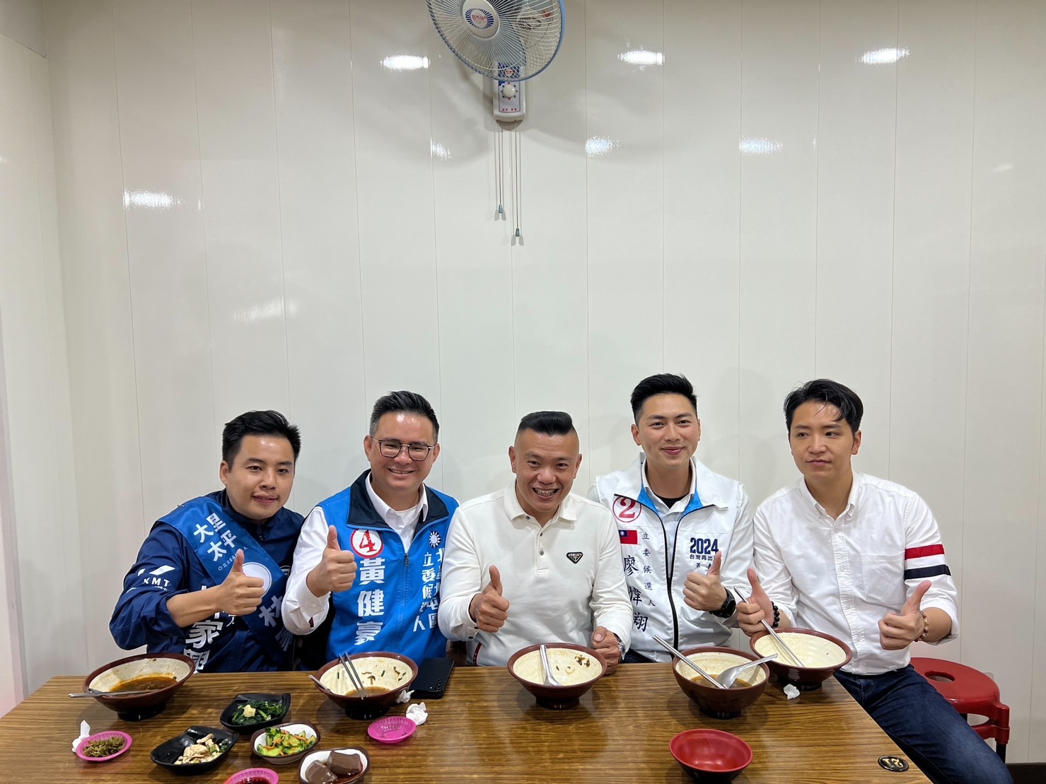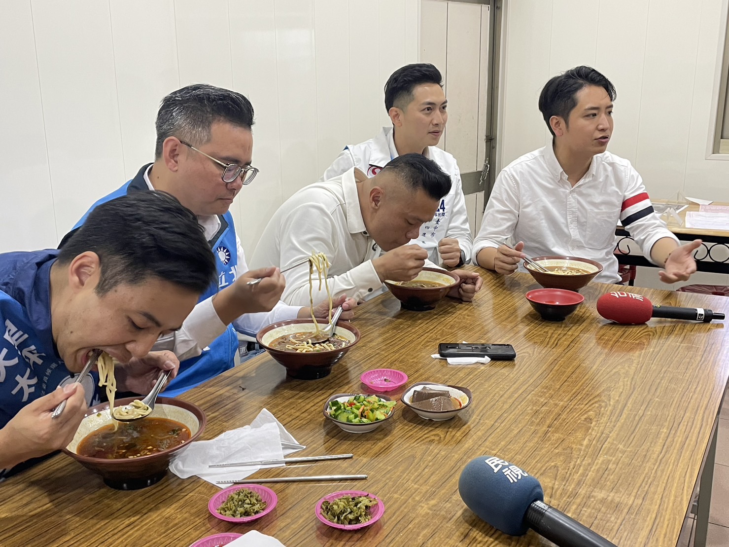 台中市第6選區(中西、東南區)立委侯選人羅廷瑋日前受民進黨立委候選人江肇國烏龍爆料指控家中經營的牛肉麵店,長期占用市府已徵收的「兒童遊樂場用地」。今日民眾黨市議員江和樹、及國民黨台中市立委參選人廖偉翔、林家興、黃健豪聯合到老鑼牛肉麵店羅廷瑋家聯合聲援。