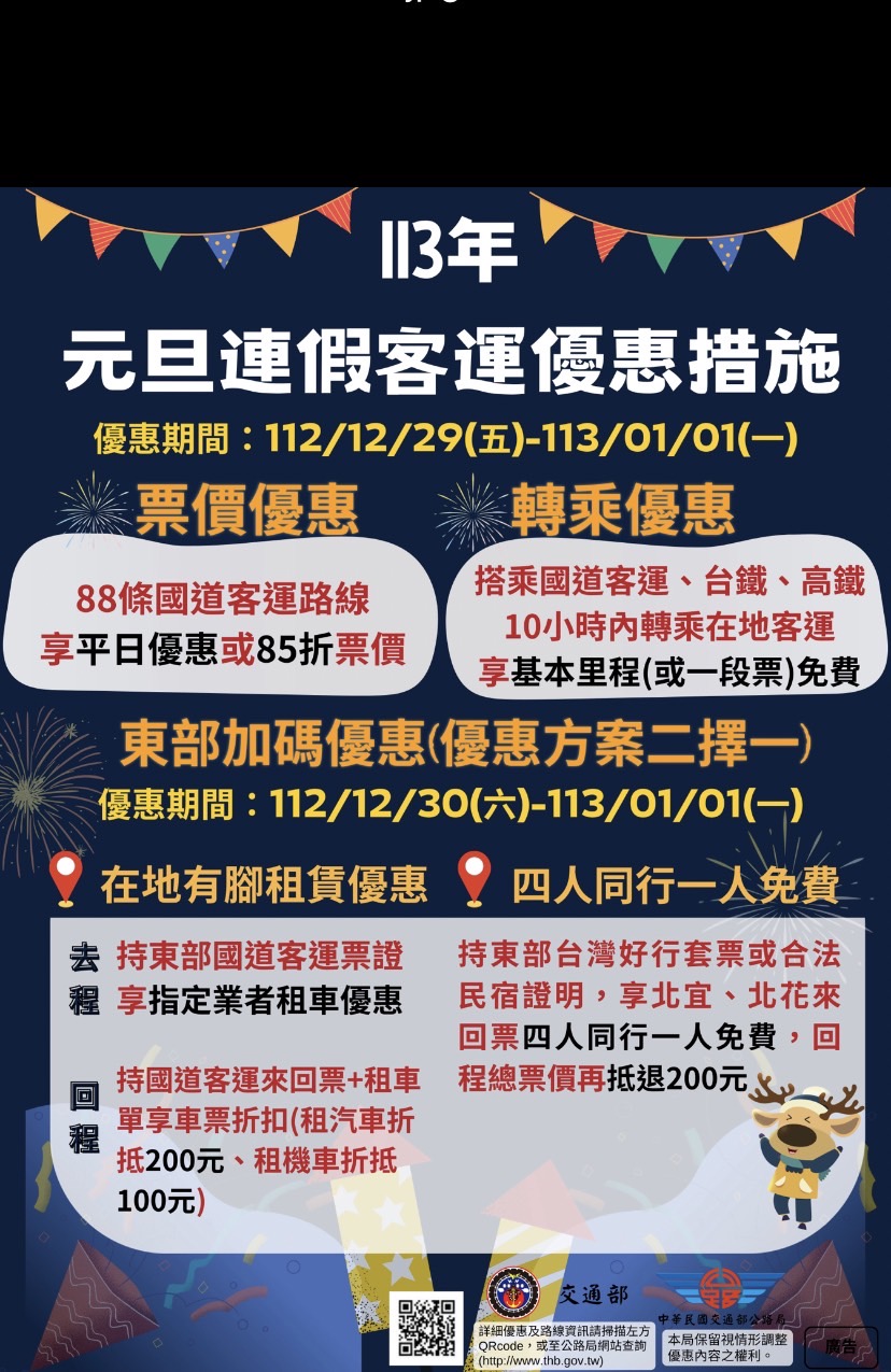 113年元旦連假,中部地區跨年活動眾多,像是臺中洲際棒球場的五月天演唱會,南投縣會展中心舉辦的2024星空閃耀南投跨年晚會等,預計將有許多民眾參與。為鼓勵民眾搭乘公共運輸及紓解交通壅塞,交通部公路局自112年12月29日起至113年1月1日止,提供「國道客運票價優惠及公共運輸轉乘優惠措施」,內容包括國道客運路線平日優惠或85折票價,搭乘國道客運、高鐵、臺鐵於10小時內轉乘在地客運享一段票或基本里程免費等,歡迎至公路局網站查詢。