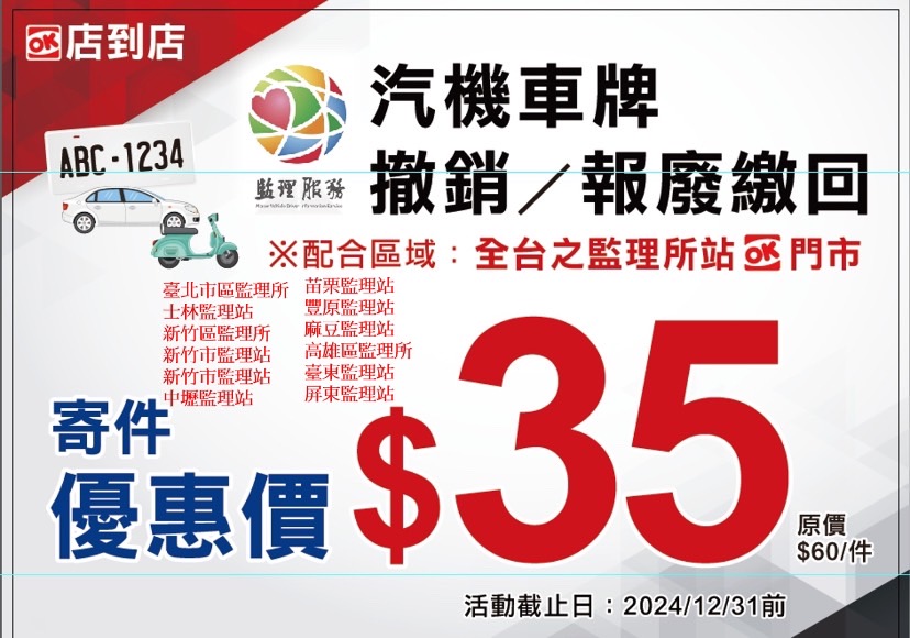 豐原監理站為解決民眾於「監理服務網」(https://www.mvdis.gov.tw/)辦理「車牌報廢、繳銷」後,繳送車牌之不便,攜手OK便利商店推出「報廢與繳、註銷車牌寄送」便民服務,民眾僅須前往全台任一間OK門市,透過店到店寄送車牌,即可輕鬆完成繳註銷報廢車牌寄送至本站。全台目前共有12間OK監理站門市,即日起至113年12月31日前,還可享有寄件費35元的優惠(原價60元),歡迎大家多加利用!!