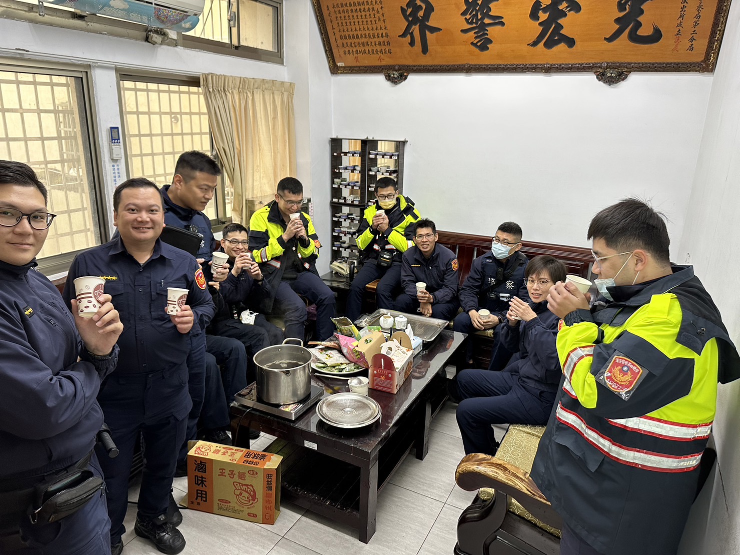 霸王級寒流凍全台!臺中清晨低溫伴隨著寒風瑟瑟、細雨飄飄,使得體感溫度更為冷冽,許多人乾脆請假在家避寒,但是警察卻「老是在外」,頂著刺骨寒風,巡邏、守望、處理各類案件及事故,一如往常維護著轄區的治、交安。中警二分局周分局長考量同仁忍著逼人寒意,堅守崗位,在冷峻的氣候下執勤格外辛勞,為了讓同仁祛寒暖身,特地請業務組採購了大批老薑及黑糖,發送給各所、隊,各外勤單位紛紛煮起一大桶冒著蒸氣的黑糖薑茶,讓返回駐地交接勤務的同仁可以喝了再上!派出所裡飄起陣陣薑母的香味及黑糖的甜味,讓原本嚴肅忙碌的氣氛添上一抹香甜的溫馨,員警端著熱騰騰的薑茶,可以說是拿在手裡、喝在嘴裡、熱在心裡,紛紛豎起大拇指,表示分局長此舉暖手暖胃又暖心,實在是「薑薑好」!