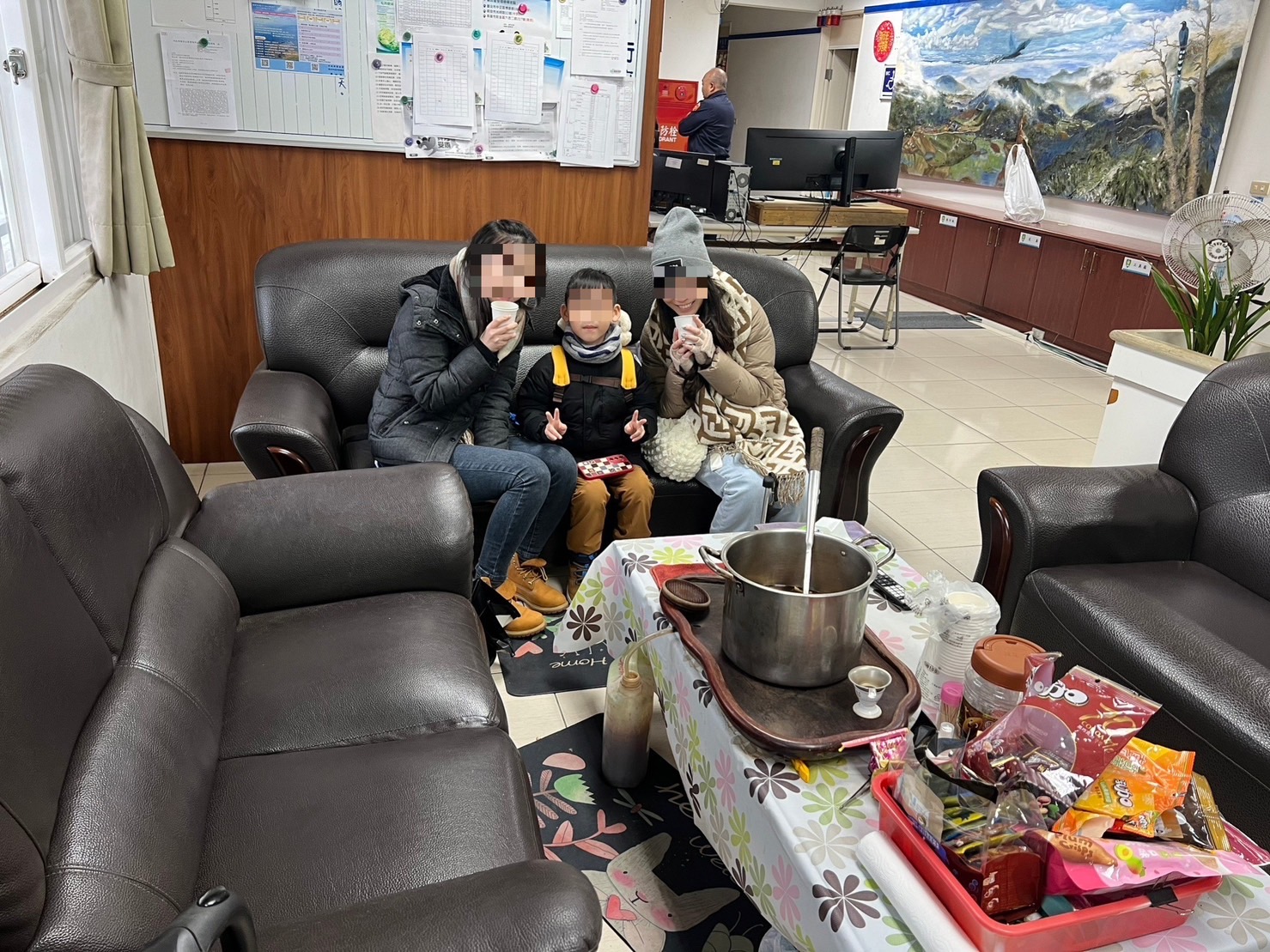 因一時興起,三個人在沒備妥衣物情況下就貿然上山,抵達目的地下了公車後三個人便不斷發抖,此時剛好看到前方有一間派出所便入內請求協助,員警陳竑文瞭解整件事情的來龍去脈後立即到廚房煮了幾碗熱騰騰的地瓜湯讓三人補充體力,稍歇片刻後三個人臉色逐漸紅潤身體也不再顫抖,離去時李姓姊妹對警方為民服務之精神深表感激,相信這趟陽明山賞雪之旅對孩子來說也是一次永生難忘的回憶!