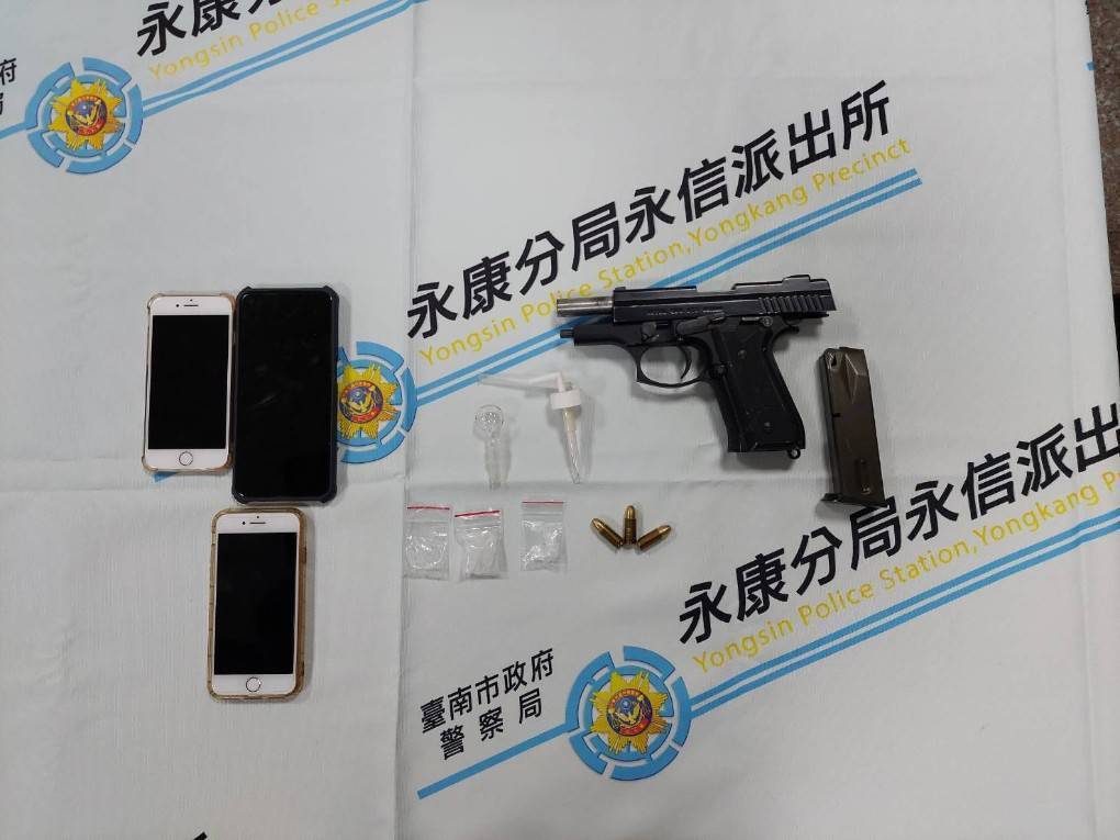 永信派出所副所長張碩峯,率警員莊竣程、葉紘維、汪駿琳等人,於昨(24日)晚間巡視轄區治安死角,約21時許發現一輛自小客車未熄火停於復國一路段紅線上,遂上前攔查,發現38歲駕駛陳男毒品通緝身分,先於身上查扣毒品安非他命,隨後查看所駕駛車輛,赫然發現駕駛座腳踏板置有非制式手槍1把,讓查緝人員捏了一把冷汗,幸犯嫌未反抗駁火,造成傷亡;後續於隨身包包內又發現毒品吸食器1批及毒品安非他命2包等;員警落實勤務,避免可能的治安事故發生;全案詢後依毒品通緝、違反槍砲彈藥刀械管制條例、毒品危害防制條例等罪嫌移送臺南地檢署偵辦,後續將深入清查槍彈及毒品來源。