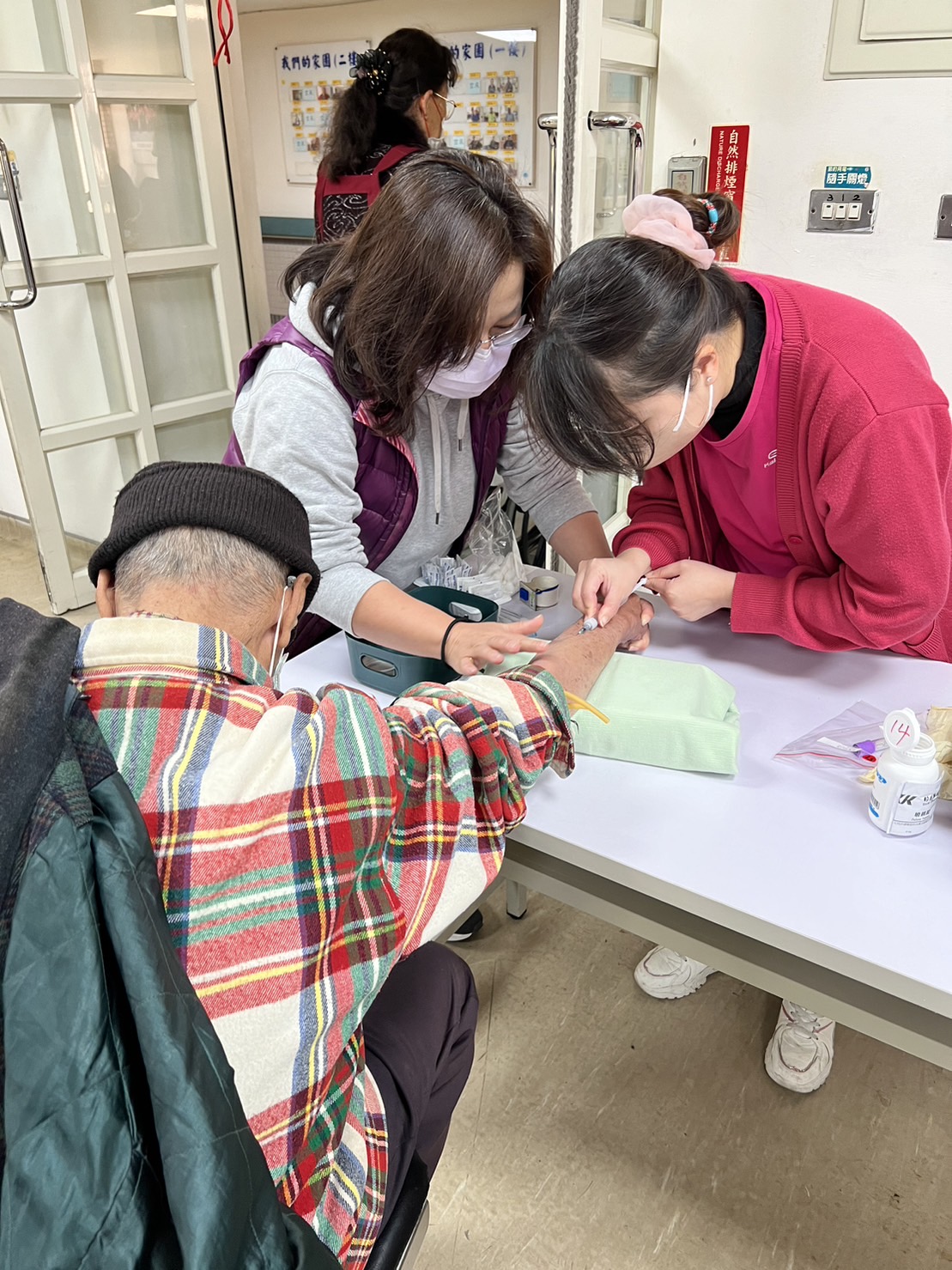 辦理住民年度健康檢查,是榮家每年很重要工作項目,藉由檢查過程提供高齡及行動不便的住民全方位護理及衛生教育。本週為期4日,榮家保健組總動員完成488位長輩的年度健康檢查,包括:身高、體重、視力、腰圍及抽血驗尿等,住民及家屬均給予高度肯定,並對醫護人員表達感謝。