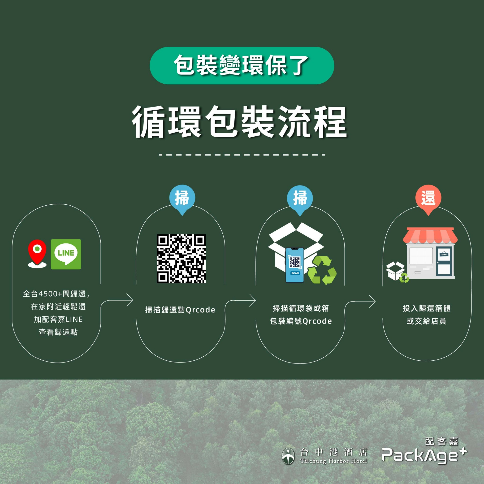 台中港酒店引進「Package+配客嘉」可循環再生的包材,以綠色環保的方式配送客人遺留物,將永續行動融入每一位旅人的生活。「Package+配客嘉」秉持著打造台灣No.1永續的理念,為提倡全球環境議題,重新設計包裝材料,減少資源的使用並提升包材的再生利用率。目前已累積65萬件循環包裝使用,減少將近20萬公斤的一次性包裝垃圾。