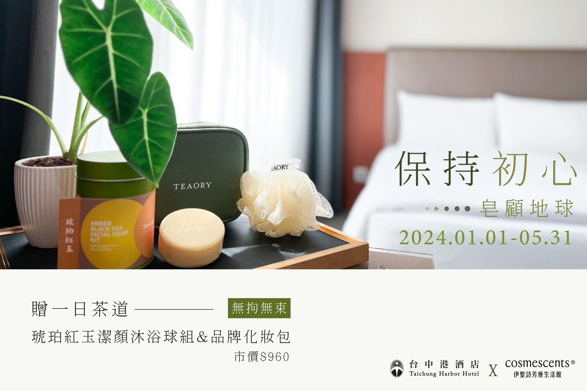 台中港酒店為延續永續行動,攜手知名品牌「伊聖詩芳療生活館」合作推出綠色住宿專案「無拘無塑‧保持初心‧皂顧地球」。讓每一位賓客入住品味優雅同時,也能參與保護地球的行動。專案涵蓋「一日茶道-琥珀紅玉潔顏沐浴球組&品牌化妝包」(價值NT$960),兩人同行平日每位只需$1,844起! 加碼入住贈台中港三井Outlet獨享禮遇三重送券,更貼心提供高鐵定點定時免費來回接駁服務,讓您輕鬆出遊享受假期!