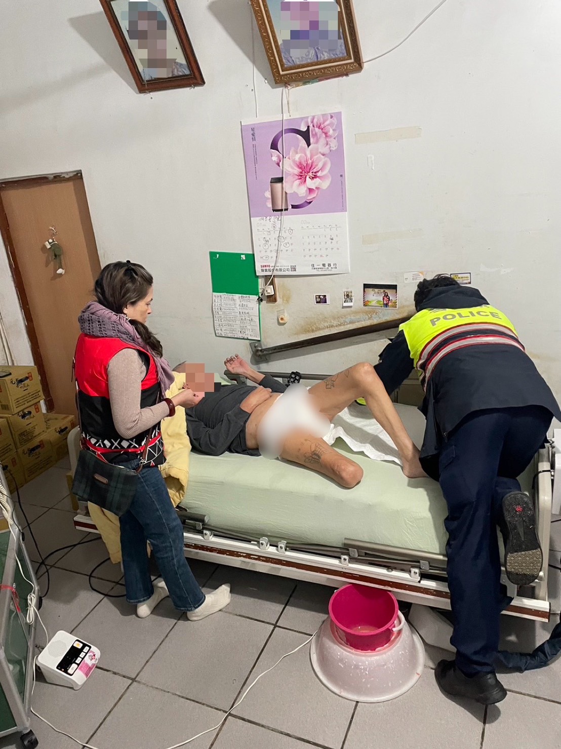 警方到場後,聽見余男的呼喊聲,副所長安撫余男情緒後與文健站職員一同將余男抬上床上,並蓋上毛毯給予保溫,經了解余男中風後導致左腳截肢行動不便,在自家醫療床上不慎跌落,倒臥在冰冷的地板上無力爬起,才按下緊急求救鈴尋求協助。