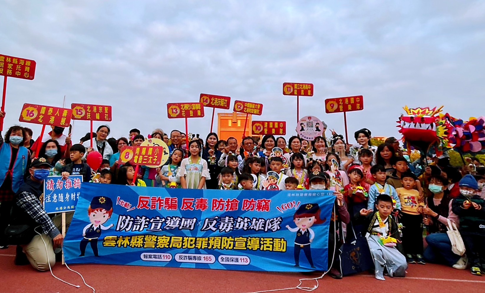 雲林縣政府、笨港媽祖文教基金會、北港鎮公所、朝天宮及在地機關、社團、學校共同攜手合作,於24日元宵節晚間引萬年聖火舉辦千人提燈踩街活動,隨著電音三太子及舞龍舞獅熱情澎湃的敲舞曲中,縣長張麗善、文化觀光處處長陳璧君到場與鄉親一起同樂。現場另與分局長張澤銘一同響應反詐氛圍,提醒民眾重視反詐騙訊息、學會辨識詐騙電話手法,以免上當受騙。