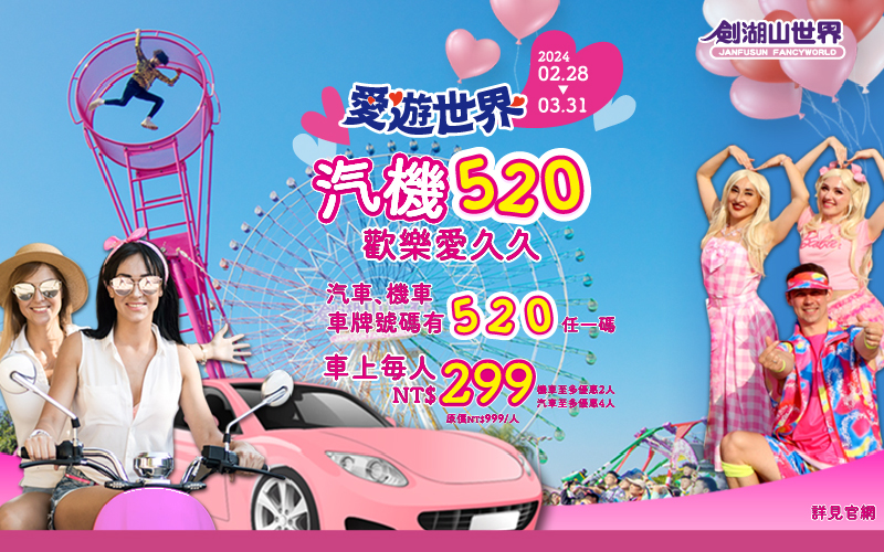 小編在粉絲專頁立即公告,「敲碗成功!你們的心聲老闆都聽到了,2/28起,汽車車牌5、2、0入園同享優惠$299」,立即吸引千位網友按讚。而「劍湖山愛遊世界」持續加碼送幸福,於2024年02月28日至2024年03月31日,推出「汽機520歡樂愛久久」,自駕遊前往劍湖山世界,且汽機車牌號碼有「5」、「2」、「0」任意一碼,憑當日停車發票與優惠憑證,門票享3折超值優惠價,每人門票只要299元(原價999元,約3折),汽車至多優惠4名、機車至多優惠2名,更多活動內容,詳見劍湖山世界官網https://www.janfusun.com.tw/fancyworld.php。
