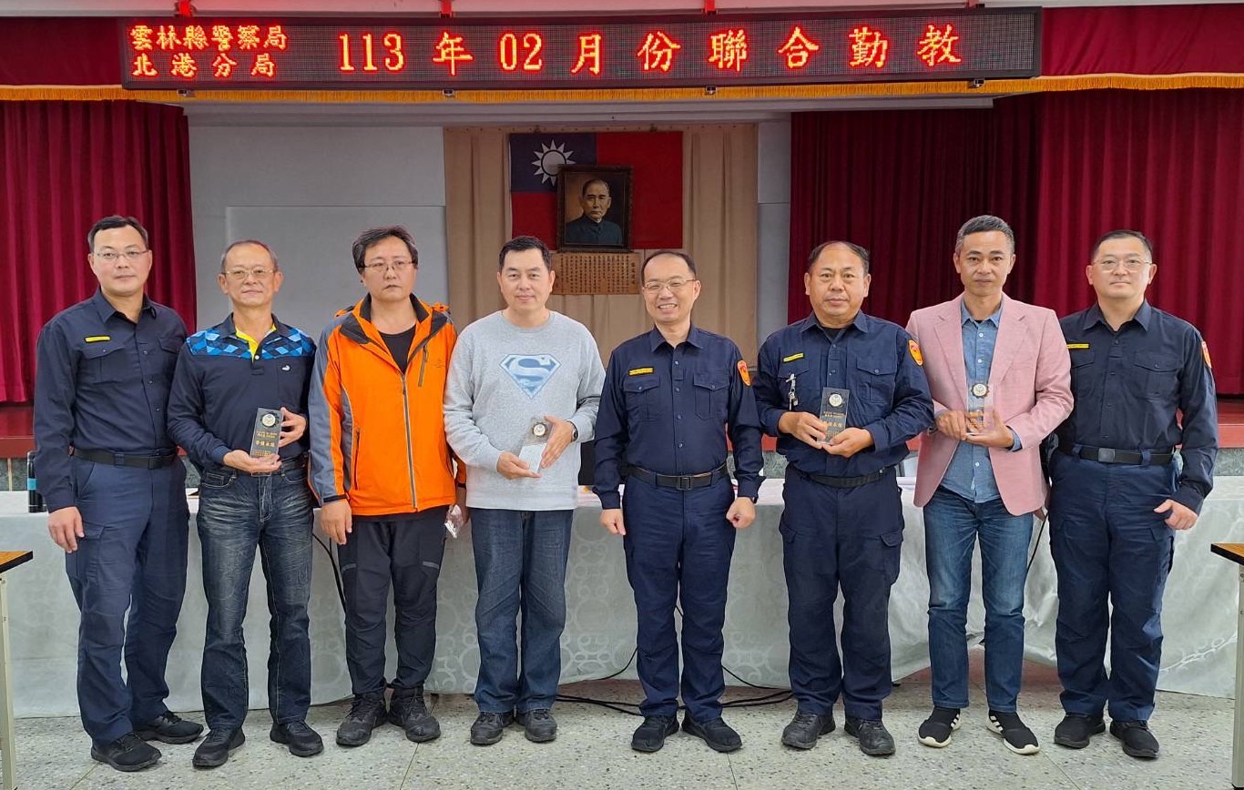 雲林縣警察局北港分局有5位官警將在3月份退休,5位榮退同事(二組巡官劉又嘉、五組巡官莊武宏、偵查隊偵查佐吳清地、交通小隊警員黃玄羽及鄭武郎)在今(29)日分局2月份聯合勤教會議,接受同仁祝福。當埸現身分享圓滿退休的喜悅,也發表工作歷程中許多的酸甜苦辣及即將退休的離別感言。