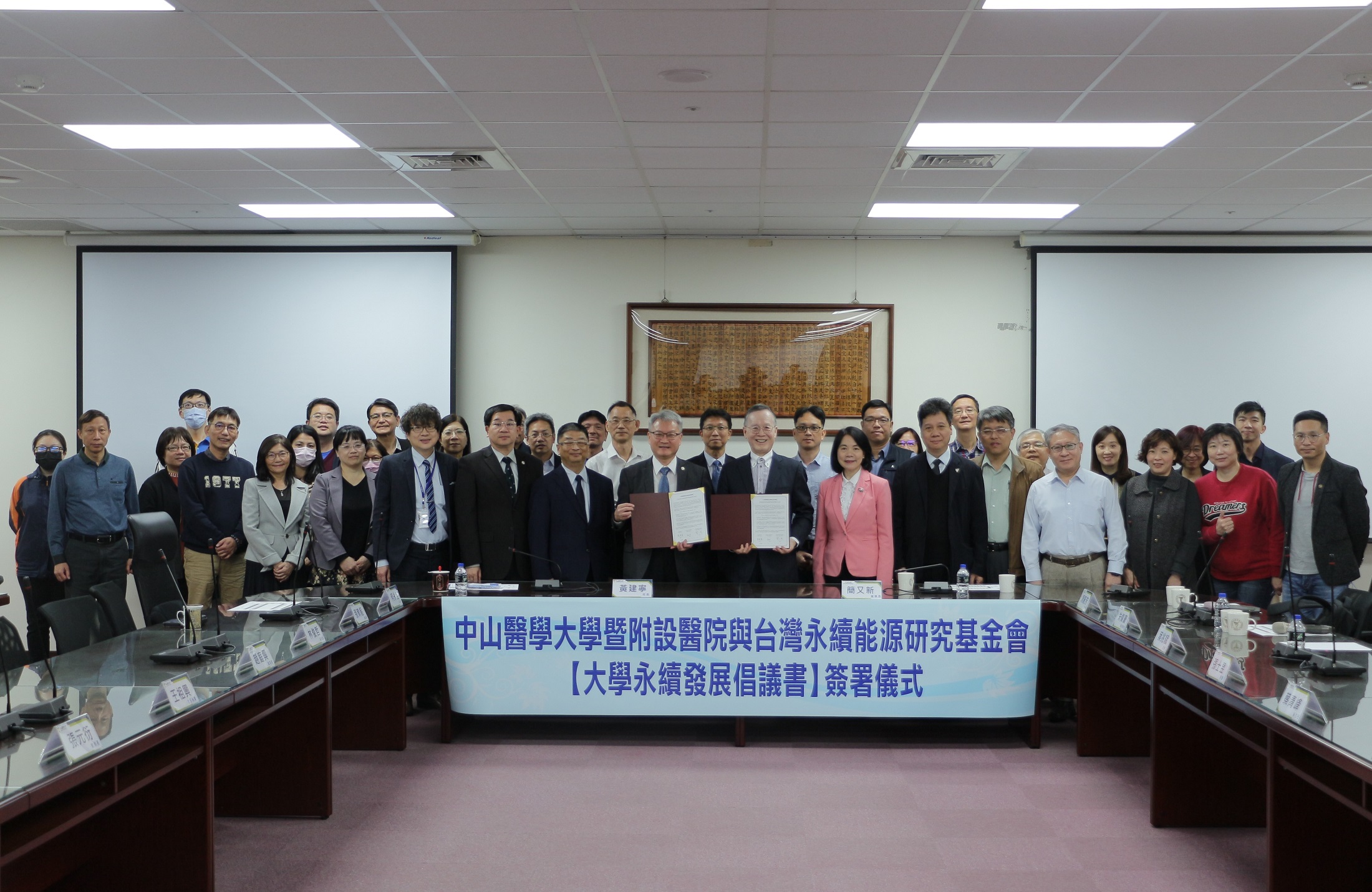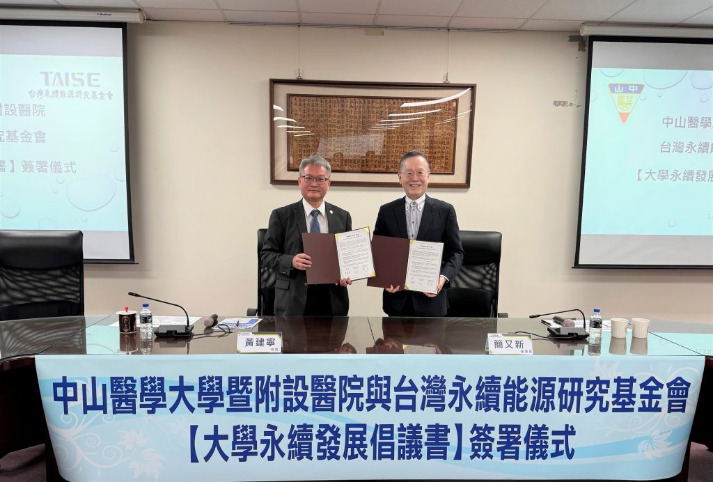 中山醫學大學暨附設醫院全體系為宣示2050淨零碳排決心,29日由校長黃建寧代表和台灣永續能源研究基金會董事長簡又新大使,共同簽署「大學永續發展倡議書」。雙方承諾將以實際行動落實環境永續,健全大學治理、發揮社會影響力,並致力推動聯合國永續發展目標(SDGs)。