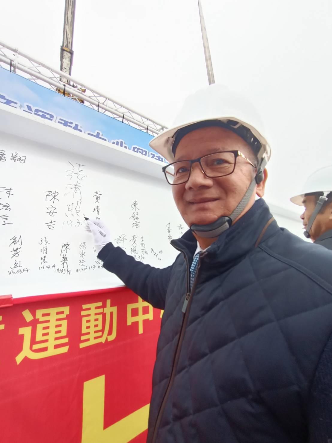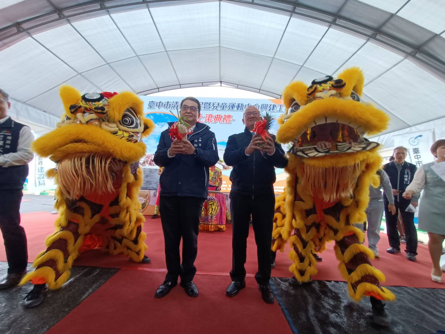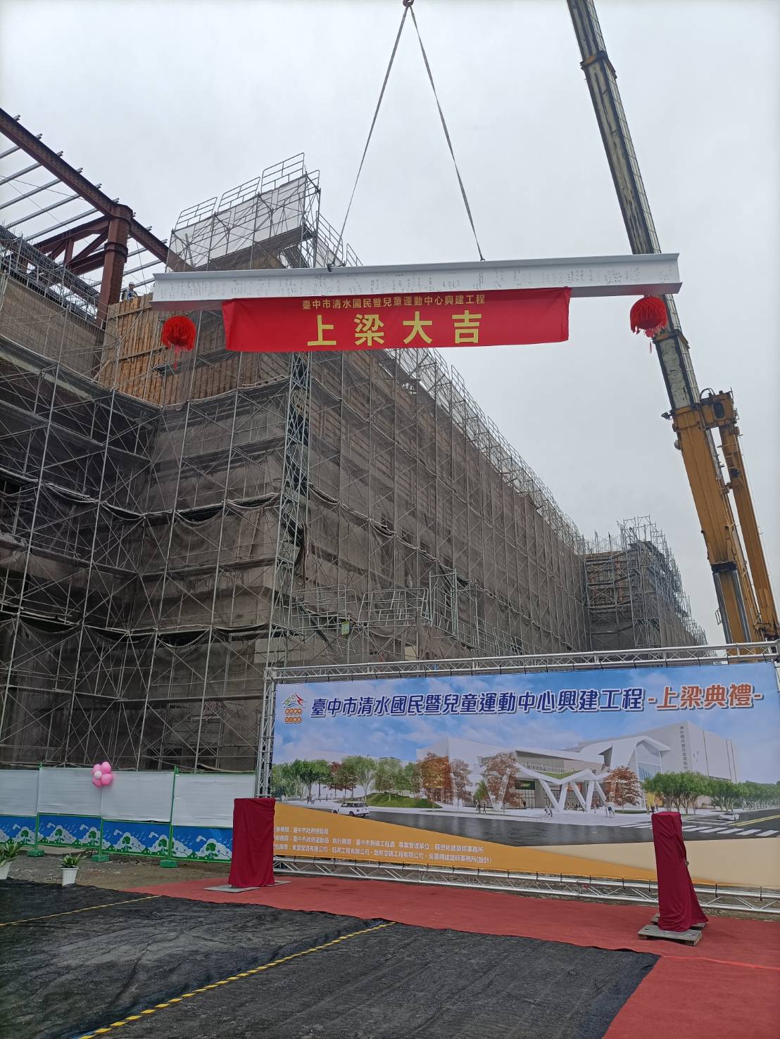 上梁典禮由台中市府秘書長黃崇典主持;張清照議長今天要主持議會大會專案報告,但這項建設是他大力爭取,特別趕來全程參與,以能了解場館的規畫,與施工進度、品質。