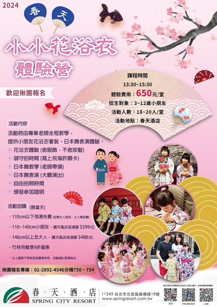 春天酒店結合北投最具特色的日式文化,首創北投「春天女兒日」花浴衣日式文化體驗活動,特別規畫孩子們穿上日式花浴衣、跳日本舞,創造一個不同以往的文化體驗活動,讓小孩與家長共同體驗多元文化的節慶氛圍!!