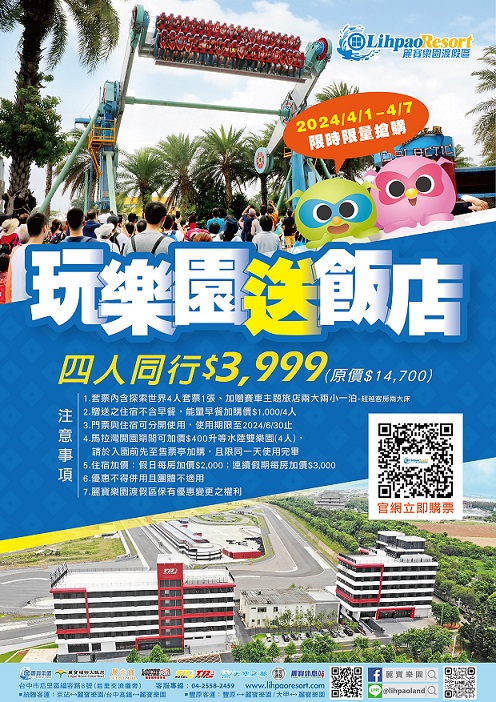 麗寶樂園渡假區感恩回饋的官網限時促銷,只要3,999元享四人同行玩樂園並入住賽車主題旅店住宿一泊(兩大兩小),即買即用,使用期限為4/1~6/30。清明兒童連假4/4(四)~4/7(日),探索世界12歲以下,只要199元絕對是家庭旅遊最優惠首選!晚鳥們也可以選擇4/4(四)~4/6(六) 16:00以後入園,雙人月光票只要499元(原價1,400元)。官網訂購https://www.lihpaoresort.com/Shop/Ticket/details/1600701549。