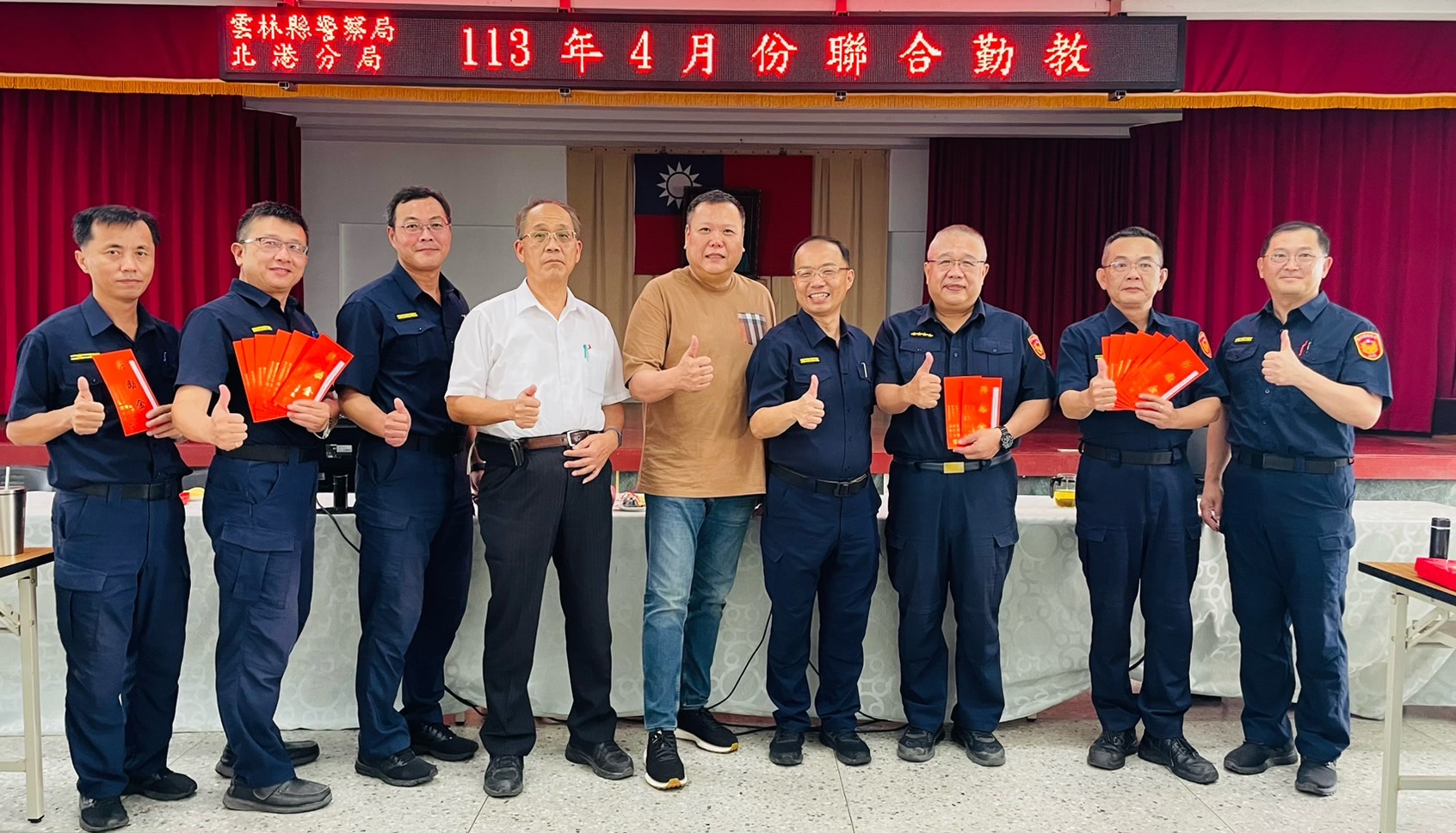 北港警分局於今(10)日下午時舉行4月「聯合勤教」,會議由分局長張澤銘親自主持,雲林縣警察之友會北港辦事處主任謝政峯特別蒞臨會場頒發今年度3月份績優員警獎勵金及致贈本年度5月份壽星生日禮券,感謝員警為地方治安默默付出,藉此激勵同仁士氣。