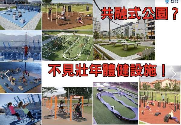李中指出,我們鄰里型的公園目前看起來都差不多,要嘛是千篇一律的老人體健設施,不然就是小朋友玩的沙坑,建設局的邏輯似乎是只有老人與小孩會去公園,青少年與壯年只能去國民運動中心或健身房之類的地方。