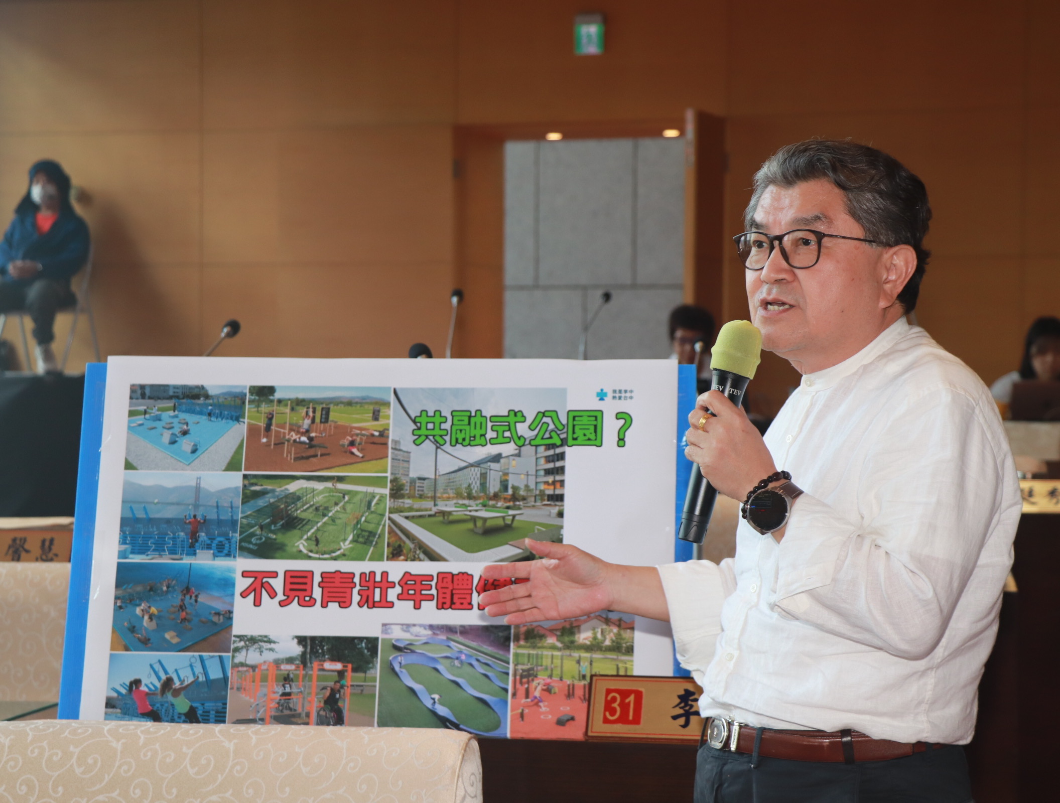 台中市議會今(11)日進行市長施政報告,針對共融式公園的建設,李中議員認為建設局不應只思考老人與小孩,國外很多的公園內還有青壯年的體健設施,希望市長、建設局、運動局能夠參考,讓我們台中市的公園更有趣、更多元。