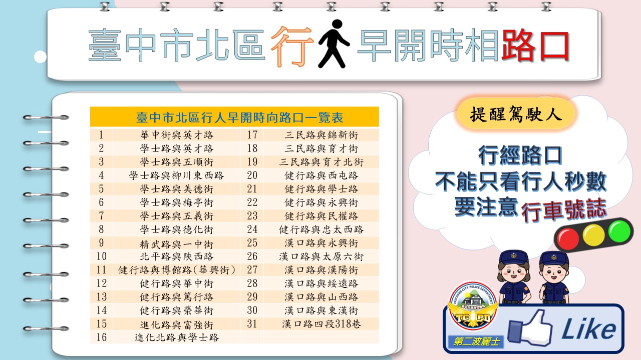 中市警二分局發現,駕駛人常在「行人早開時相」有提早起步違規行為,製作兩則交通短影音,並透過分局的臉書粉絲專頁加強宣導,提醒駕駛人行經路口時,別緊盯行人號誌秒數,而應該要視「行車號誌」(燈號)來行駛。