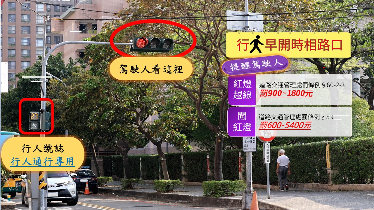 所謂「行人早開時相」(Leading Pedestrian Interval),就是行人綠燈早開措施,指車輛可行的綠燈亮起前3至10秒,會先亮行人可先行的小綠人燈號,示意行人先穿越馬路。此設計減少人車爭道,能提高行人能見度,藉以保障「行人優先路權」。