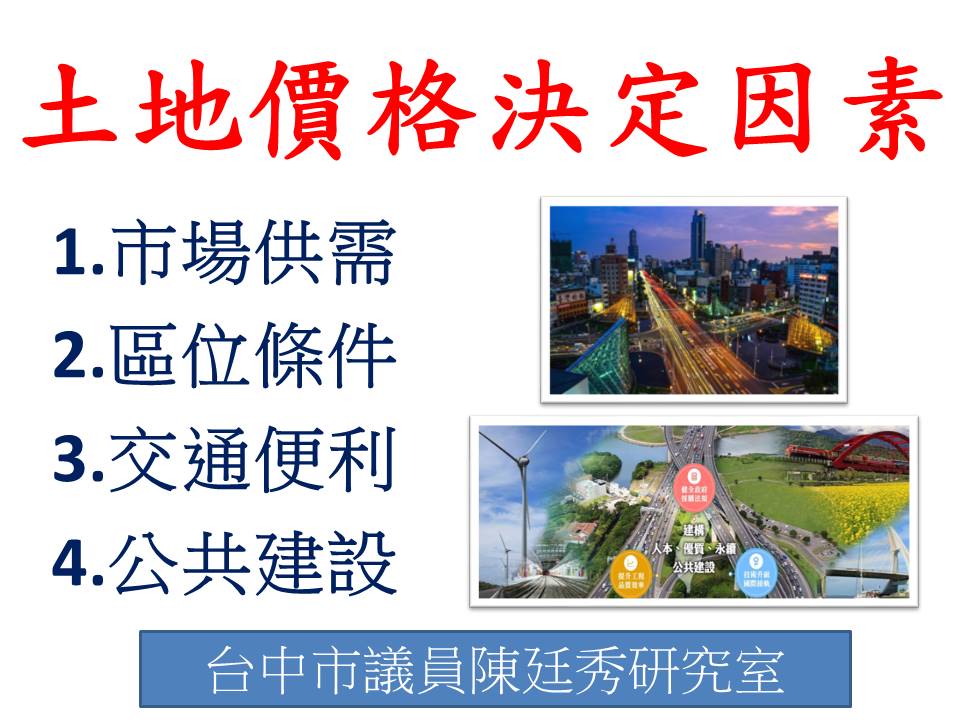 今(16)日台中市議會專案報告質詢上,台中市議員陳廷秀強調都市發展過程房地價一定會隨著上漲,可依據台北市地政局時價登錄統計資訊來做參考標準,由於臺北市各項公共設施、交通便利、地理條件都是最優勢,台北市房價依舊是全台居高不下,台中市房地價急起直追台北市,因為各項公共建設、交通便利性也跟著水漲船高,必然的都市發展過程。